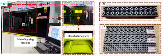 In this study, specimens were fabricated using selective laser melting (SLM) technology with 316L stainless steel powder as the feedstock. To achieve the geometric configurations of the target TPMS lattices, three−dimensional models were constructed in MATLAB and exported in the stereolithography (STL) format. The above STL files were processed via commercial slicing software to complete layer−wise scan path planning and process parameter configuration. The generated toolpath data were then transmitted to the control system of the ZRapID iSLM 280 printer(ZRapid Tech, Suzhou, China) for additive manufacturing forming. Figure 8 schematically illustrates this fabrication workflow, and Table 2 summarizes the key processing parameters used in the experiments. First, Primitive−type homogeneous bending specimens were fabricated, with a plate thickness of 2 mm and an initial unit cell thickness of 2 mm (see Figure 8b); this dimension is applicable to large bending behavior. Subsequently, three types of graded sandwich structure specimens with Primitive, Gyroid, and Schwarz−Diamond as the core layers were further fabricated (see Figure 8c), its dimensions are consistent with the design dimensions mentioned in Section 2.