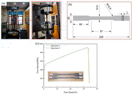 Material tensile test: (a) MTS Landmark material testing machine. (b) Standard tensile test specimen. (c) True stress–strain curve of 316L.