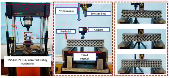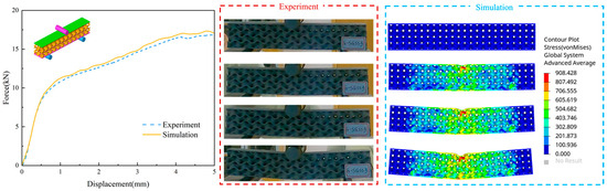 To evaluate the accuracy and dependability of the finite element model, a uniform Primitive sandwich structure was used for comparison. The three−point bending test was carried out on an INSTRON 1342 universal testing equipment(Instron, MA, America) in accordance with ASTM C393 [34]. The setup included a fixed span of 100 mm, with both the supports and indenter having a diameter of 10 mm.