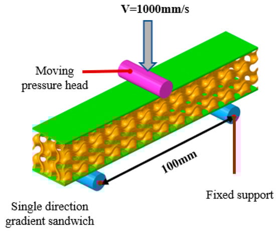 This section examined the bending response of graded TPMS sandwich structures under various loading rates using numerical simulations and experimental validation. The LS−DYNA explicit dynamics solver and HyperMesh for preprocessing were used. The TPMS core was given the MAT_24 material model (piecewise linear plasticity) in the finite element model, which accounts for elastic−plastic behavior. MAT_20 was used to model the loading indenter and supports as rigid bodies. Four−node tetrahedral elements (tet4) were used to discretize the TPMS core, while eight−node hexahedral elements (hex8) were used to mesh the face sheets, indenter, and supports. In order to precisely capture contact and sliding behavior, automatic surface−to−surface contact was defined between the structure and the indenter and supports. The TPMS core was connected to the face sheets via node−to−surface coupling. The coefficients of static and dynamic friction were established as 0.3 and 0.2, respectively. The indenter applied a 24 mm downward displacement at a constant speed at the mid−span of the upper face sheet, while the two support rollers were completely limited for boundary conditions. The finite element model is illustrated as Figure 11.