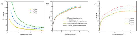 Loading velocity and mesh convergence analysis: (a) variation of kinetic energy to internal energy ratio; (b) comparison of different mesh element algorithms (1.0 mm mesh); (c) mesh convergence analysis.