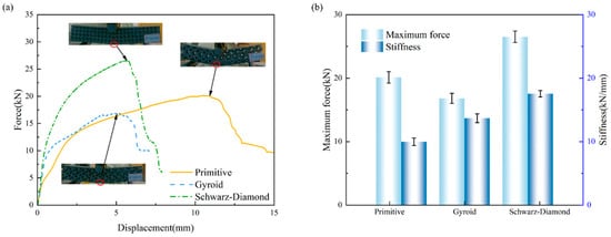 Three−point bending test results of gradient sandwich structures: (a) force–displacement curves; (b) peak force and stiffness.