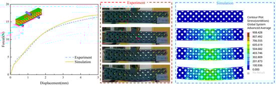 Comparison of simulation experiments: (a) Force–displacement curve. (b) Deformation process of simulation and experiment.