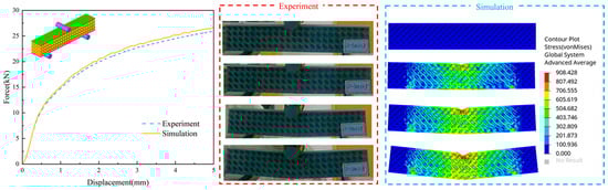 Figure 15 compares the load–displacement curves, deformation processes, and stress nephograms of Primitive core sandwich structures under three−point bending conditions, incorporating data from both experimental tests and numerical simulations. In terms of the load–displacement curves, the experimental and simulation results exhibit good overall agreement, with the simulation results slightly higher than the experimental values. Such discrepancies may be jointly attributed to specimen manufacturing defects, imperfect core–face bonding, friction uncertainty, boundary irregularities, and differences in simulation loading rates; the deformation processes of the two also show high consistency. Analysis of the simulated stress nephograms indicates that during the initial 5 mm deformation stage, the stress concentration of the Primitive core sandwich structure is mainly concentrated in the core of the upper loading area. This phenomenon is dominated by the interlaminar shear effect between cells, and the overall stress distribution of the structure is uniform without obvious signs of failure.