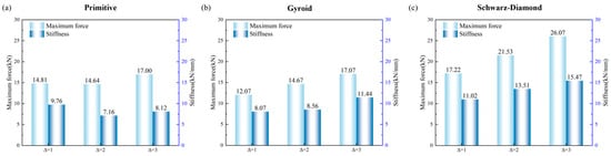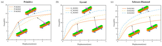 Load–displacement curves under different gradients: (a) Primitive; (b) Gyroid; (c) Schwarz−Diamond.