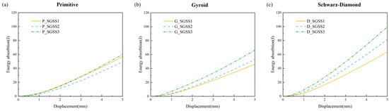 Energy absorption–displacement curves of TPMS sandwich structures under different gradient coefficients: (a) Primitive; (b) Gyroid; (c) Schwarz−Diamond.