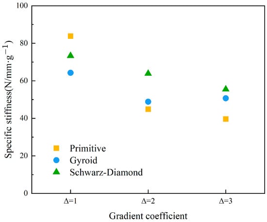 Because of the differences in TPMS topologies, their masses are not equal even at the same gradient coefficient of 1. To distinguish between the density−driven effect and the topology−driven effect, the specific stiffness is thus introduced, whose definition is given by Equation (15).