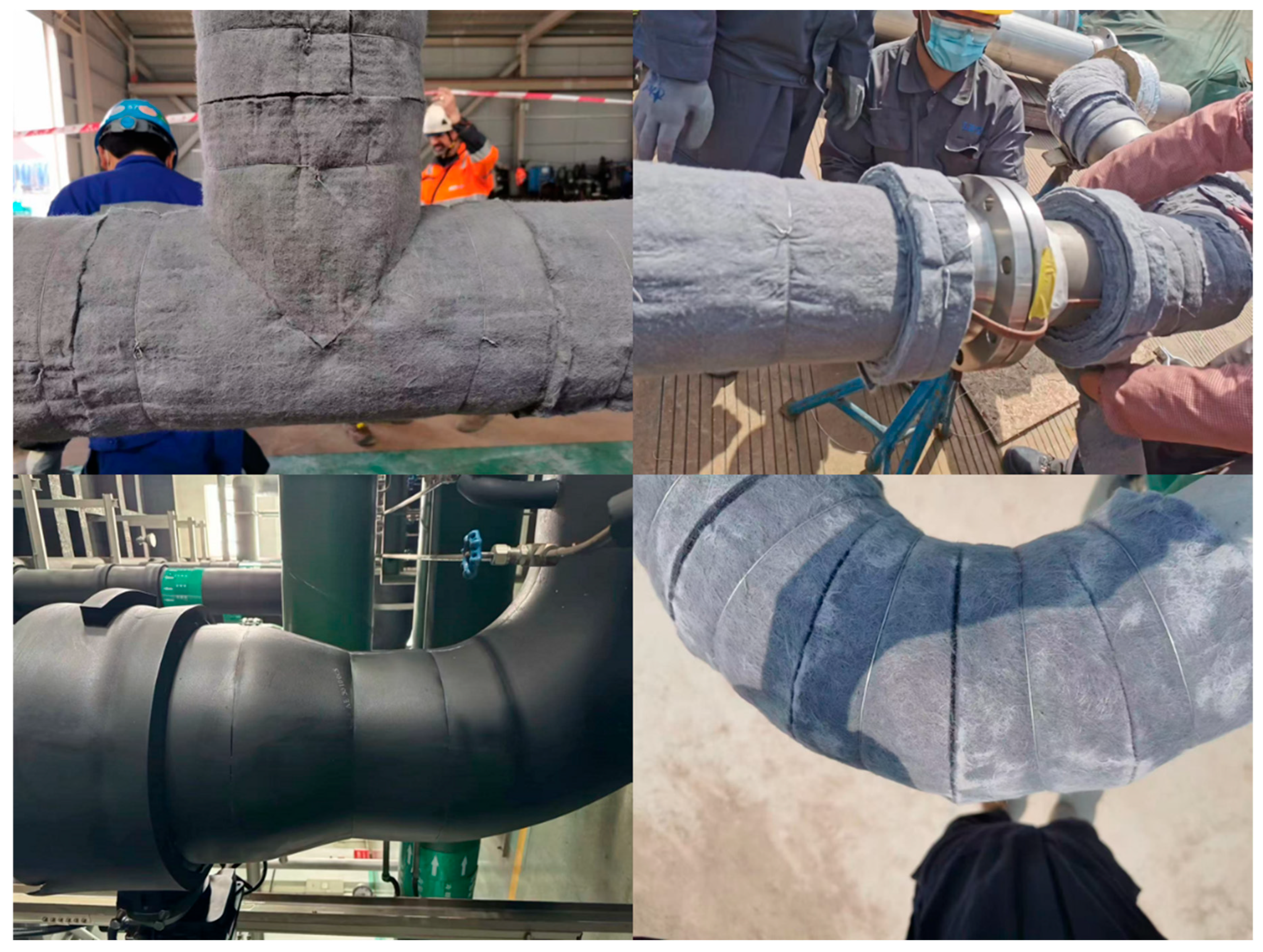 Thermal insulation structures are broadly categorized into two types: internal and external insulation structures [5,6,7,8,9,10]. External insulation is widely adopted, particularly in miniaturized piping devices, as shown in Figure 1, owing to its mature technology, structural simplicity, ease of maintenance, and relatively low implementation cost. However, its application to high-temperature devices presents several critical limitations. First, the pressure-bearing shell exhibits substantial mass and thermal inertia, necessitating considerable thermal energy input to achieve operational equilibrium, which significantly elevates the power demand and energy consumption of electric heating systems. Second, for intermittently operated devices, repeated cycling between ambient and elevated temperatures subjects the shell to cyclic thermal stresses, promoting cumulative thermal deformation over time. Consequently, effective thermal decoupling of the load-bearing shell becomes essential, which complicates structural design and integration. Third, conventional carbon steel shells suffer pronounced reductions in allowable stress and elastic modulus at elevated temperatures, compromising structural integrity and rendering them unsuitable for sustained high-temperature service. This necessitates substitution with high-temperature resistant alloys or composites, entailing higher material costs and more demanding fabrication processes. Given these constraints, internal insulation emerges as a technically superior and more viable solution for thermal protection in large-scale, high-temperature devices.