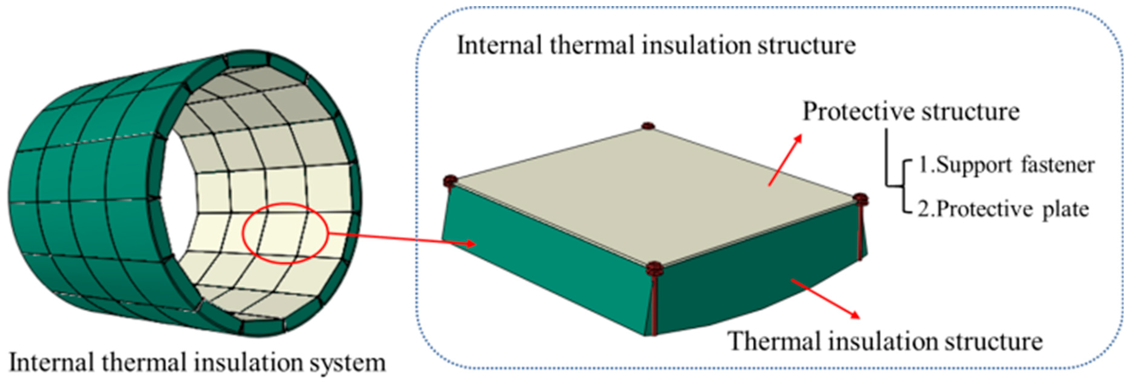 In high-temperature devices, the internal thermal insulation system is widely recognized as an integrated solution that simultaneously achieves cost-effectiveness and superior thermal insulation performance [19,20]. The internal thermal insulation system serves to maintain a stable high-temperature operating environment for the device, and its reliability critically governs the overall thermal insulation performance of the device. To prevent fracture of thermal insulation structure and to facilitate the manufacturing, transportation, assembly, and maintenance, the internal thermal insulation structure is deliberately designed as an assembly of multiple discrete insulation elements [7]. Moreover, beyond delivering excellent thermal insulation performance and ensuring internal environmental stability, the thermal insulation structure also contributes significantly to the device’s overall structural integrity [21]. Consequently, the internal thermal insulation structure is configured as a composite system comprising both a protective layer and a dedicated thermal insulation layer, as shown in Figure 3.