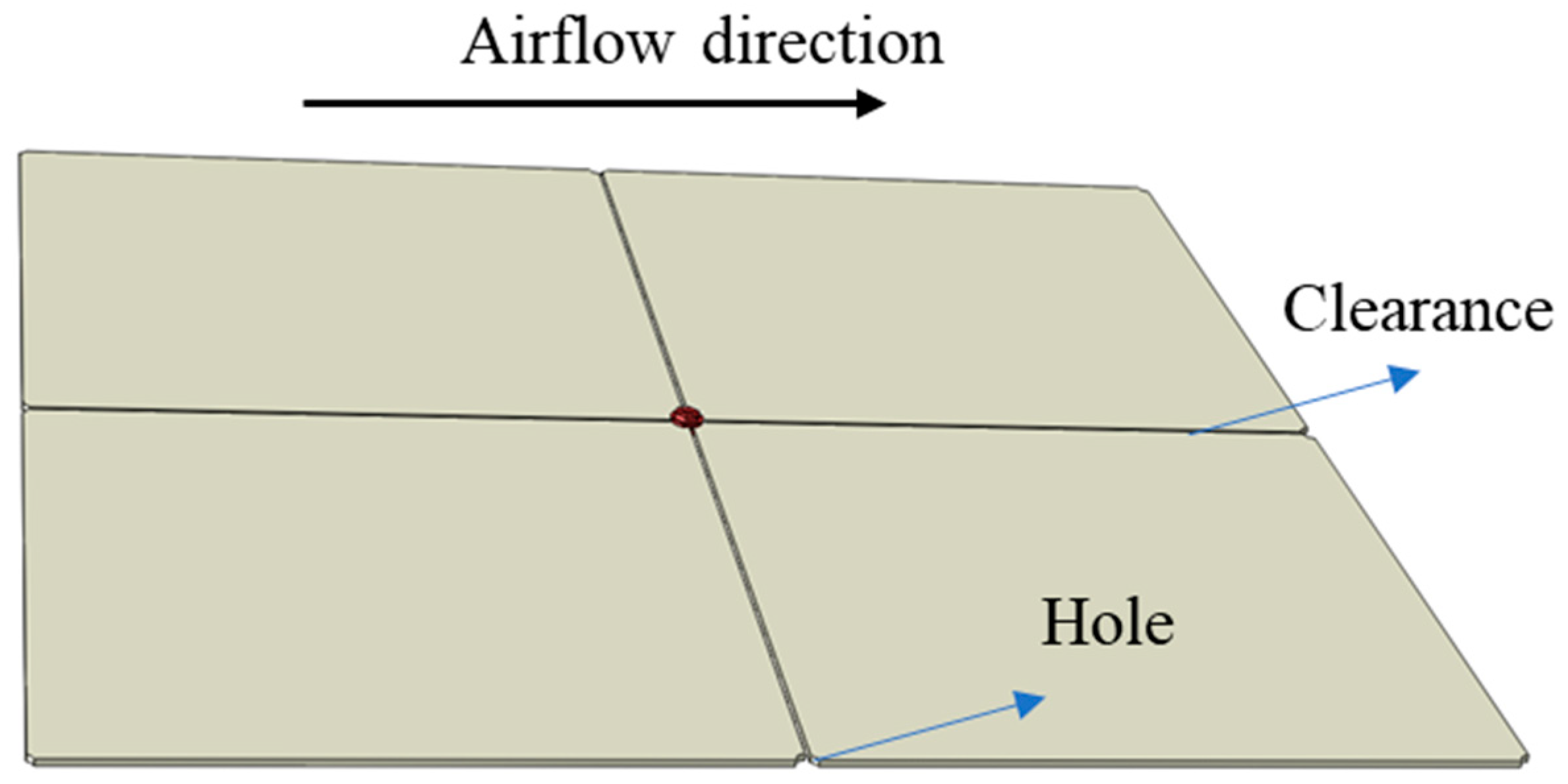 The protective structure comprises a support fastener and a protective plate. The protective plate, fabricated from 310S stainless steel and measuring 1000 mm × 956 mm × 10 mm, is affixed to the device’s inner wall via the support fastener, thereby establishing a stable internal field. Each protective panel is installed with an 8 mm clearance in both the circumferential and longitudinal directions, as shown in Figure 4, enabling free thermal expansion and contraction under elevated temperatures. This design prevents deformation of the internal flow surface, thereby enhancing the safety and reliability of the protective plate. Additionally, four quarter-circle holes, with a radius of 15 mm, are machined at the corners of the protective plate to accommodate the installation of the support fastener.