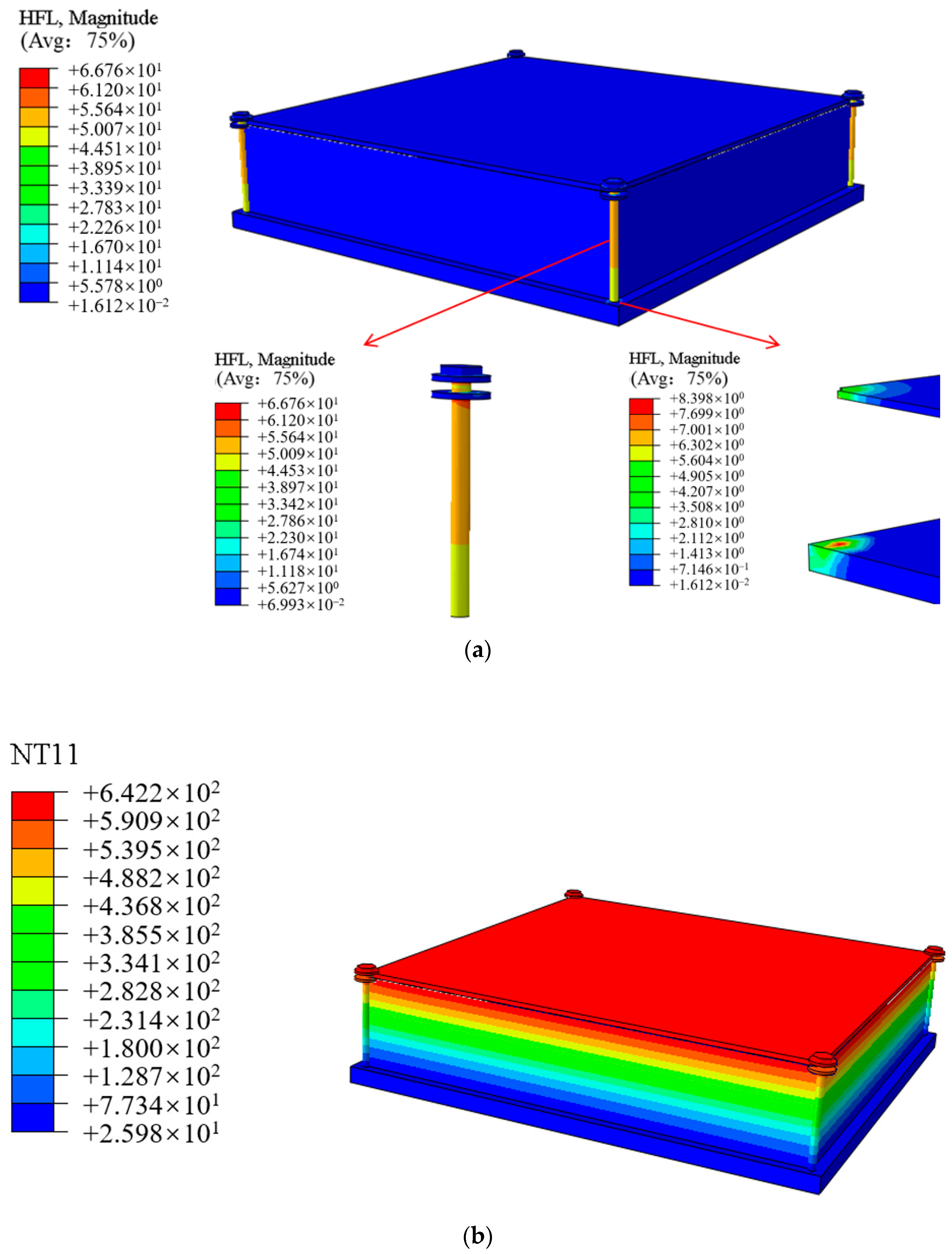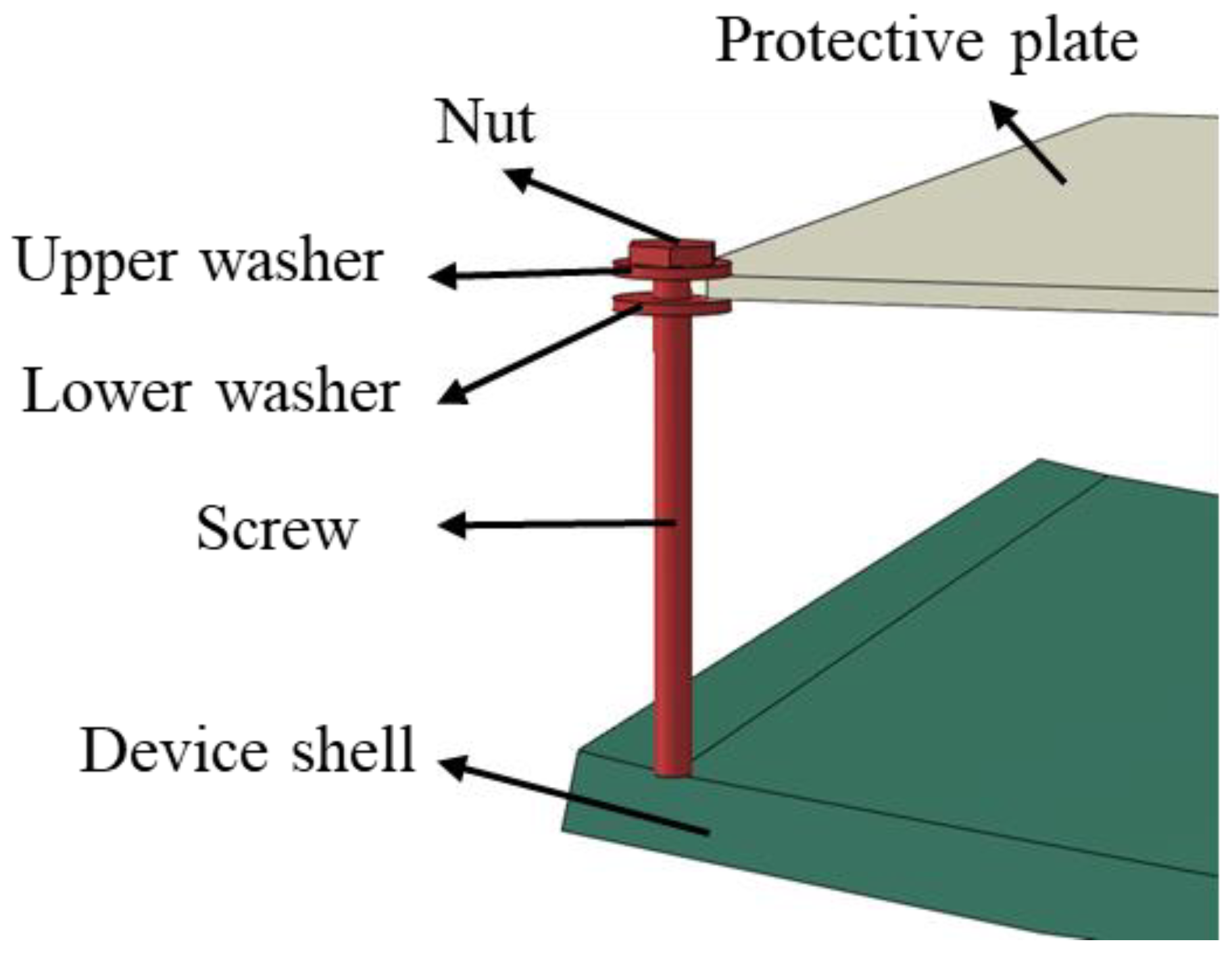 As shown in Figure 9, the upper surfaces of the protective plate, nut, and washer are exposed to the high-temperature airflow at 647 °C. The corresponding convective heat transfer coefficient between the upper surfaces of the protective plate, nut, washer, and the hot airflow is 60 W/(m2·°C). In contrast, the outer surface of the device shell is exposed to an ambient temperature of 25 °C, with the convective heat transfer coefficient of 10 W/(m2·°C) between the shell surface and the surrounding environment [22]. Additionally, all other boundaries of the computational model are assumed to be adiabatic by default. To accurately capture interface heat conduction between the protective plate and washer, the interfacial thermal contact conductance is prescribed as 100 W/(m2·°C).