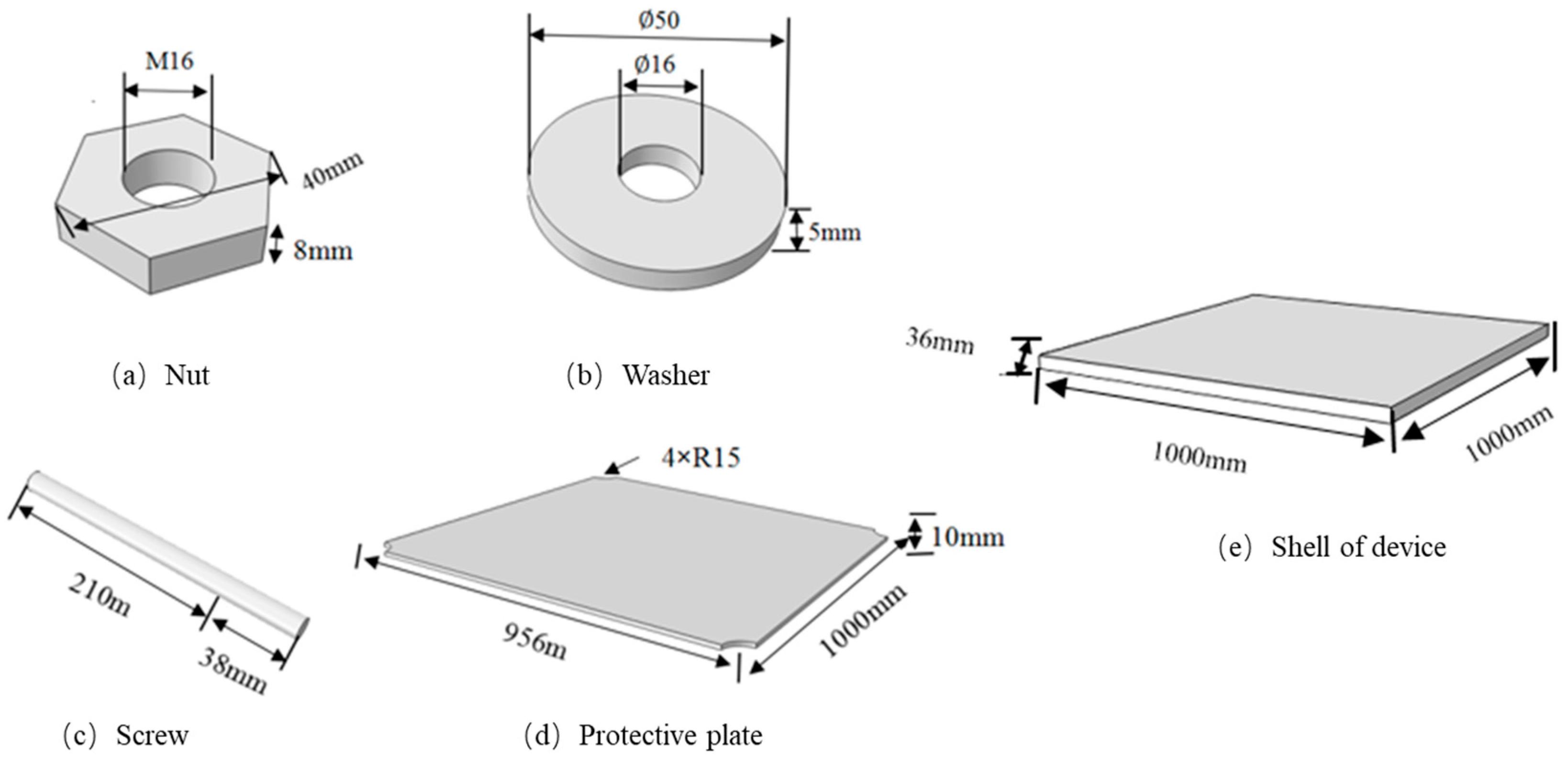 The support fastener comprises an M16 bolt assembly incorporating a non-standard nut, washer, and screw, all fabricated from 310S stainless steel. Non-standard washers and nuts are employed primarily because commercially available standard components are undersized. Their reduced dimensions compromise the required clamping force, thereby increasing the risk of protective plate detachment. The screw passes through the pre-drilled hole in the protective plate and is secured using upper and lower washers and nuts, as shown in Figure 5. The opposite end of the screw is welded directly to the inner wall of the device. A layer of thermal insulation material is applied circumferentially around the external surface of the screw to mitigate thermal bridging at the screw locations and to reduce thermal stress concentration at the welded joints.