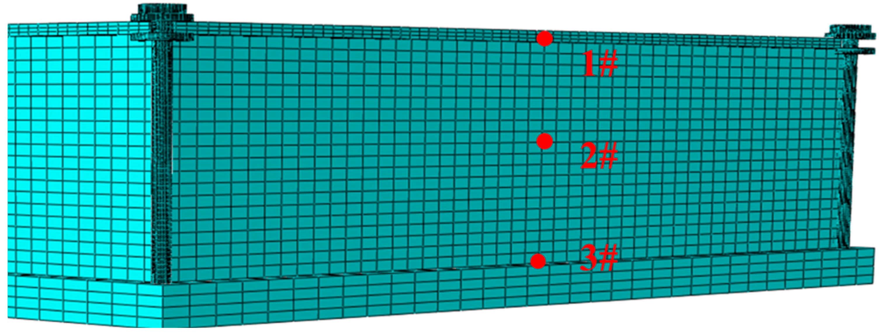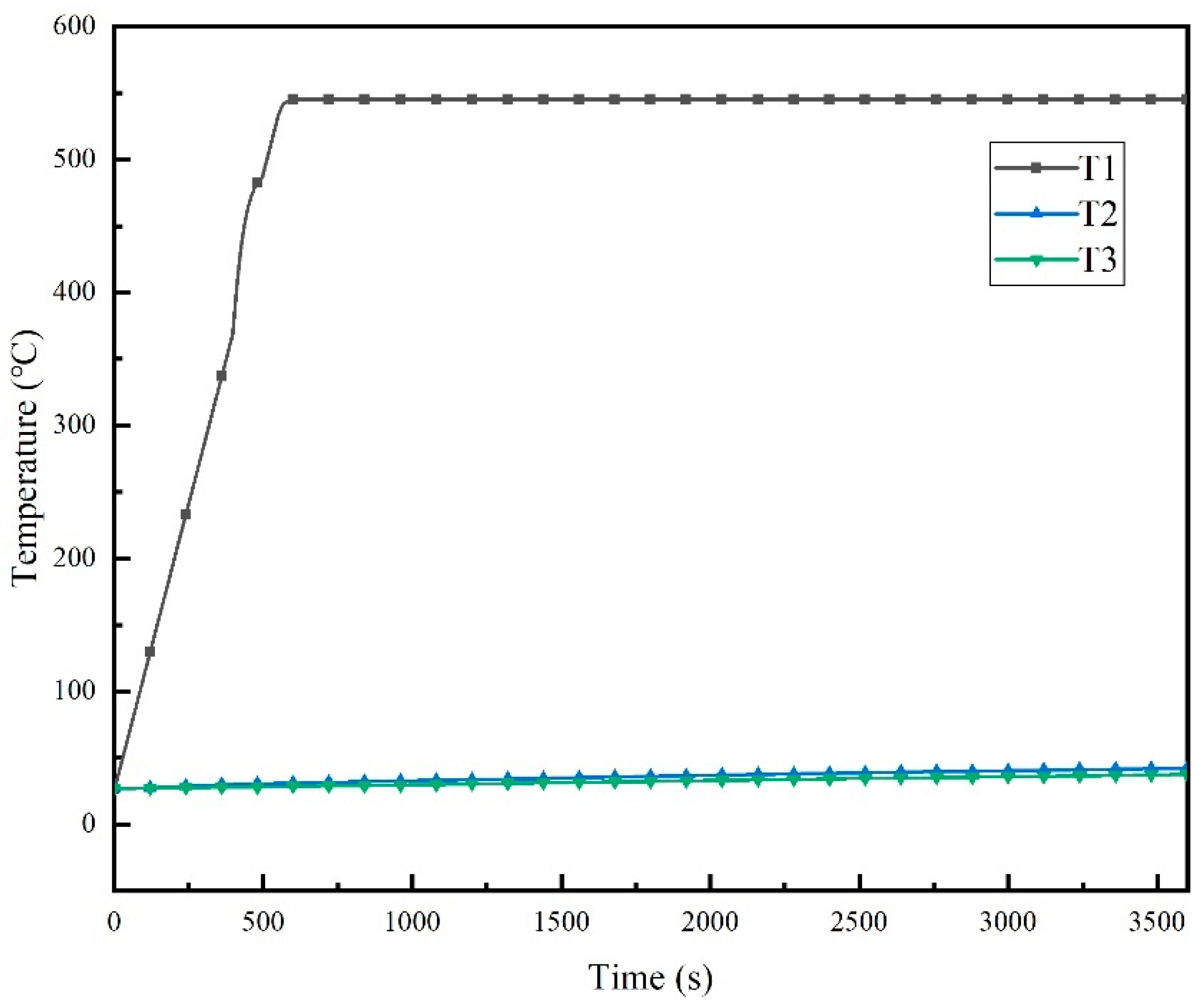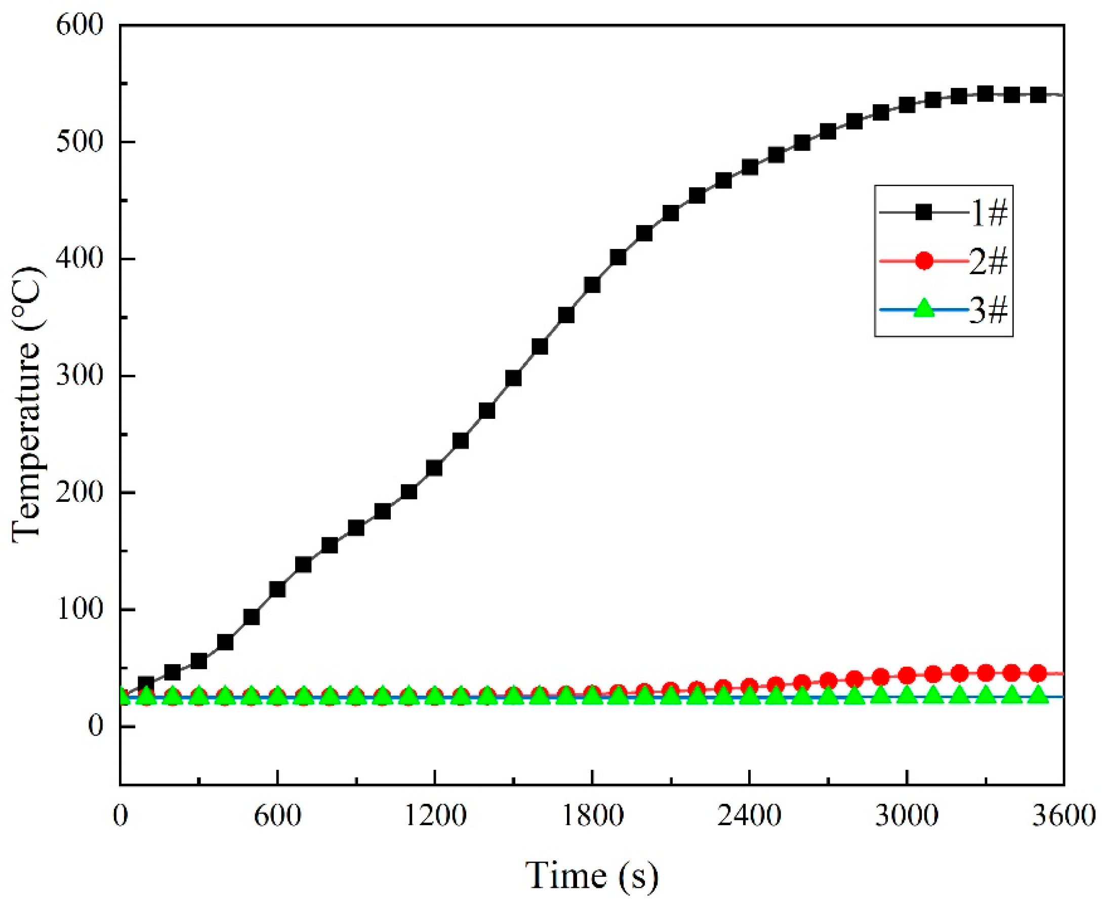 To directly illustrate the temperature distribution across the thickness of the insulation layer, three representative points, 1–3, are marked along the thickness direction, respectively, as shown in Figure 11. Point 1 is located at the upper surface of the insulation layer, point 2# is located in the mid-thickness of the insulation layer, and point 3# is located at the lower surface. The corresponding curves of temperature vs. time for these three points are presented in Figure 12. As shown in Figure 12, under the influence of a high-temperature boundary condition, the temperature at point 1 rises rapidly from the initial temperature to approximately 540 °C and subsequently stabilizes. In contrast, the temperature at point 2 rises extremely slowly to about 45 °C, while the temperature at point 3 remains virtually unchanged from the initial temperature. These observations unequivocally demonstrate the superior insulation capability of the silica aerogel flexible mat, which is fully consistent with the temperature field distribution in Figure 10.