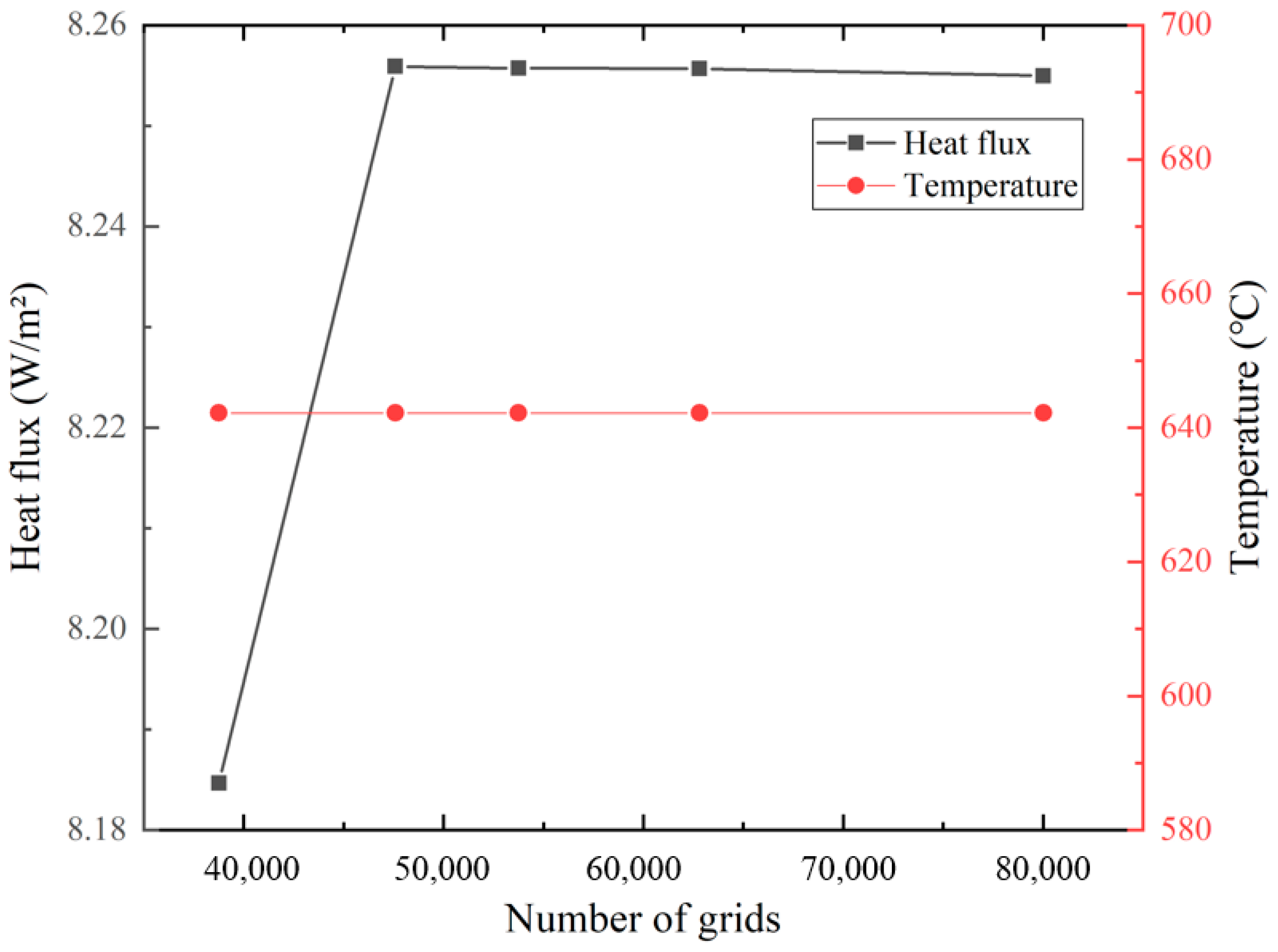 Additionally, the calculations on mesh independence are conducted, and the corresponding results of a center point on the surface of the nut are shown in Figure 13. We find that both the heat flux and the temperature of the point tend to stabilize and reach convergence.