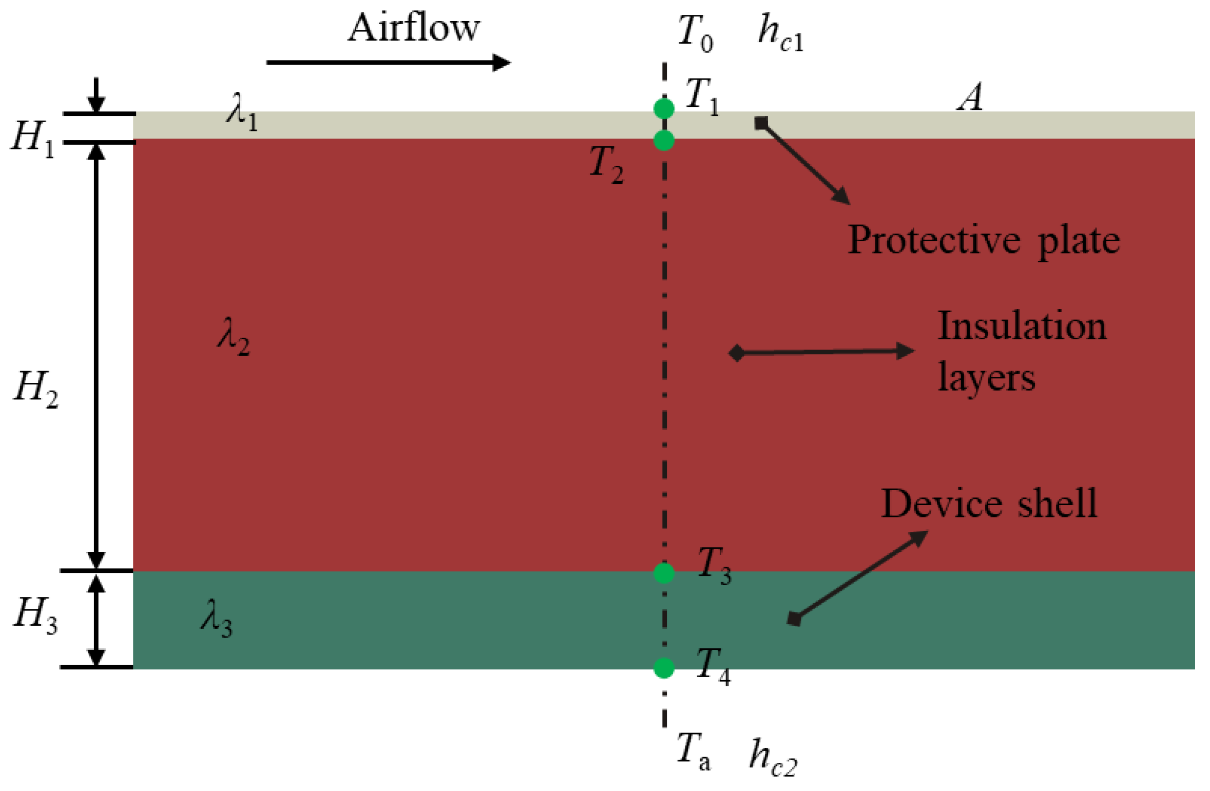 In Figure 14, A is the cross-sectional area, hc1 is the convective heat transfer coefficient between the airflow and protective plate, H1 and λ1 are the thickness and heat conductivity of protective plate, respectively, H2 and λ2 are the thickness and heat conductivity of insulation layer, respectively, H3 and λ3 are the thickness and heat conductivity of device shell, respectively, hc2 is the convective heat transfer coefficient between the device shell and environment, and T0, T1, T2, T3, T4, and Ta are the temperatures of airflow, the inner surface of protective plate, the interface between the protective plate and the insulation layer, the interface between the insulation layer and the device shell, the outer surface of the device shell, and the environment, respectively.