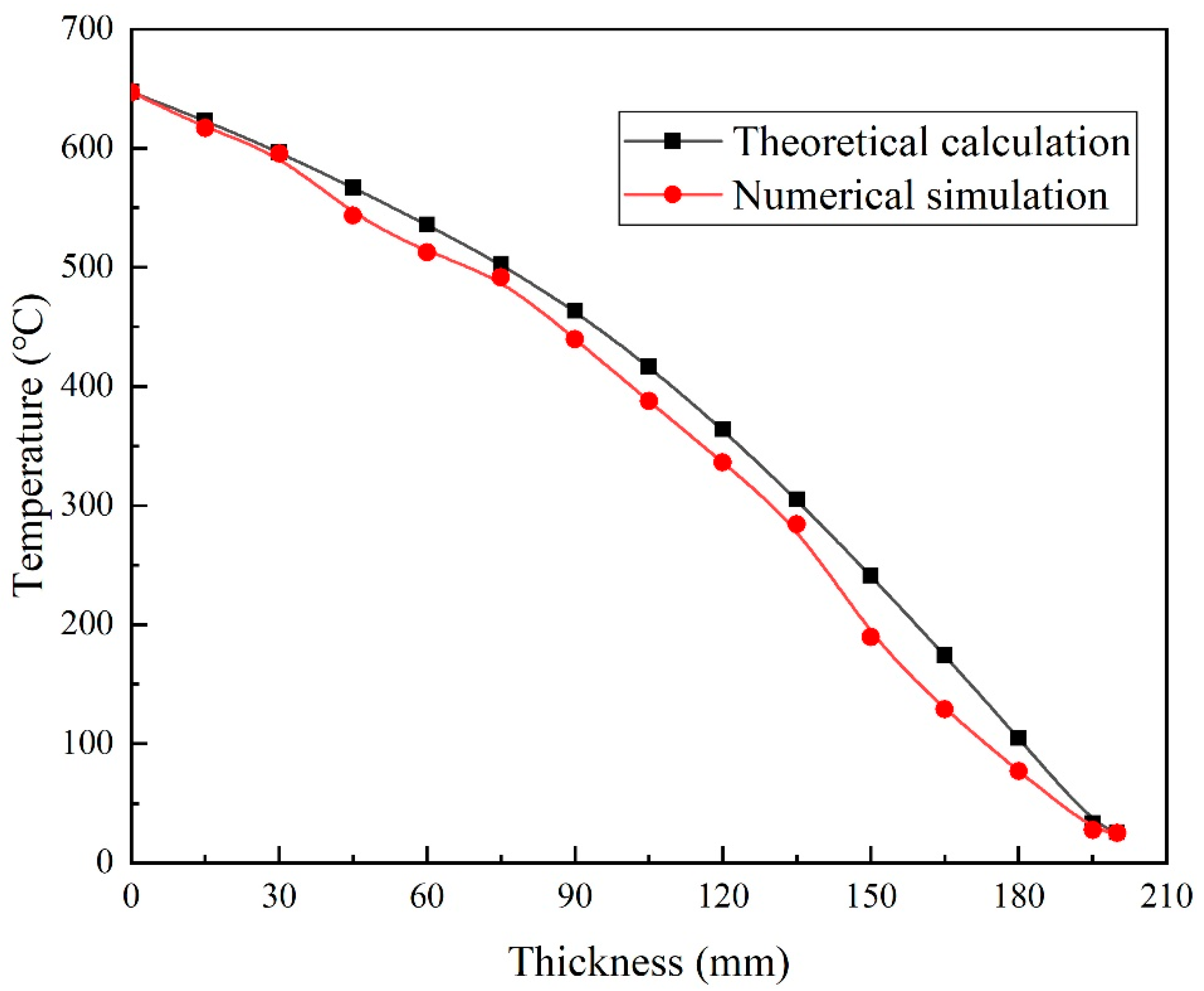 According to the above calculation process, the temperature along the thickness direction of the internal thermal insulation structure is calculated, and that obtained by numerical simulation is also gathered, as shown in Figure 16.