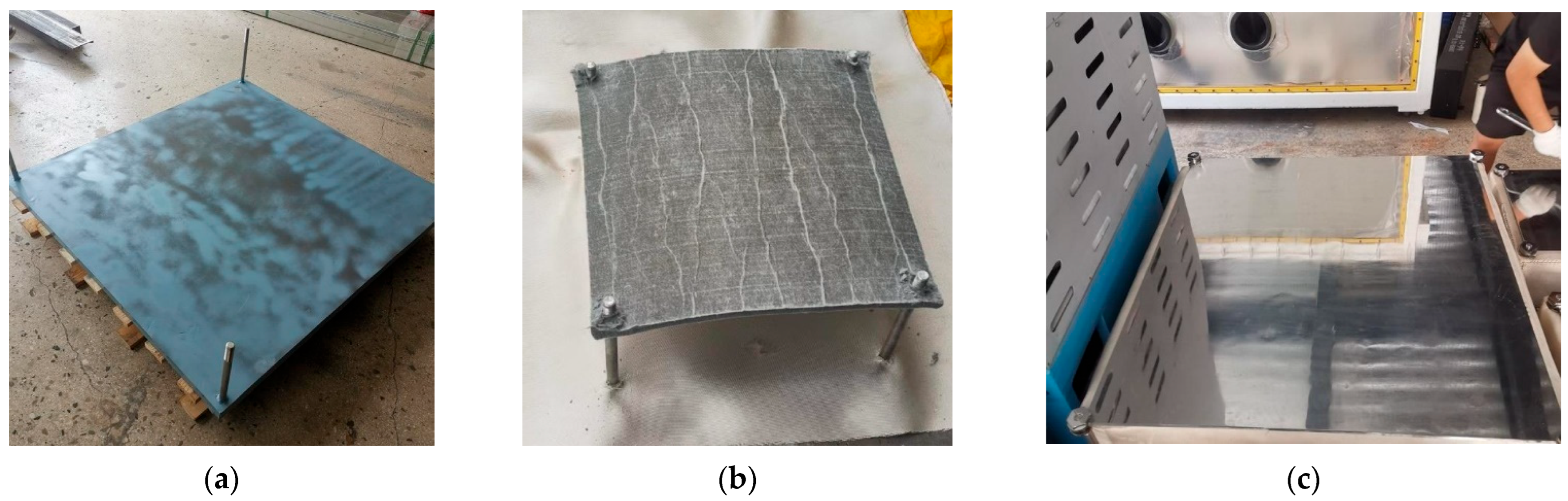 The fabrication process of the specimen is shown in Figure 17. First, screws are fully penetrated and welded perpendicularly onto the four corners of the device shell surface, as shown in Figure 17a. Then, four aligned holes are drilled through each insulation layer to accommodate the screws, enabling precise alignment and assembly, as shown in Figure 17b. Finally, the protective plate, washers, and nuts are assembled to compress and secure the multilayer thermal insulation materials, thereby completing the specimen of the internal thermal insulation structure, as shown in Figure 17c.