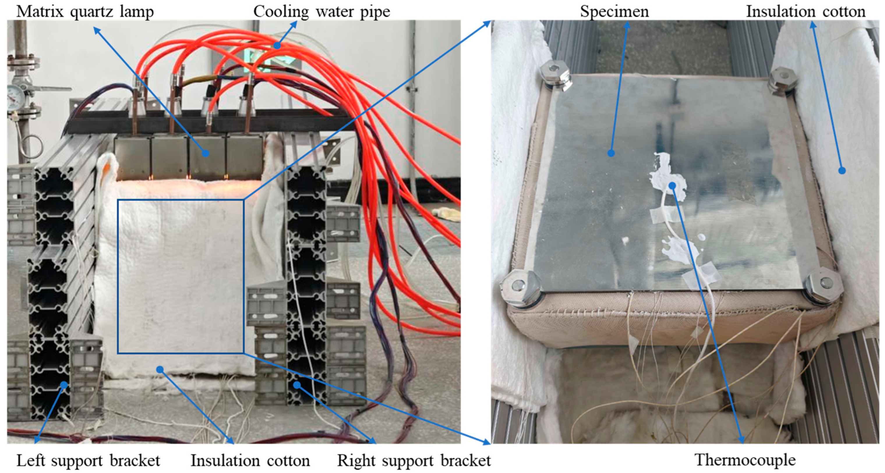 Given the elevated operating temperatures experienced by the insulation structure during device operation, an experimental platform is developed as shown in Figure 18. The platform mainly contains a matrix quartz lamp, a cooling water circuit, and a support bracket. The matrix quartz lamp serves as the controllable heat source for heating the specimen. The cooling water circuit is applied post-experiment to dissipate residual heat from the lamp. The support bracket, including the left support bracket and the right support bracket, is applied to support the lamp.