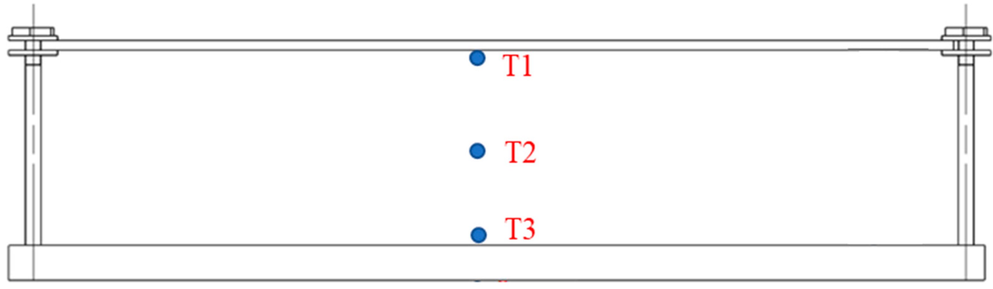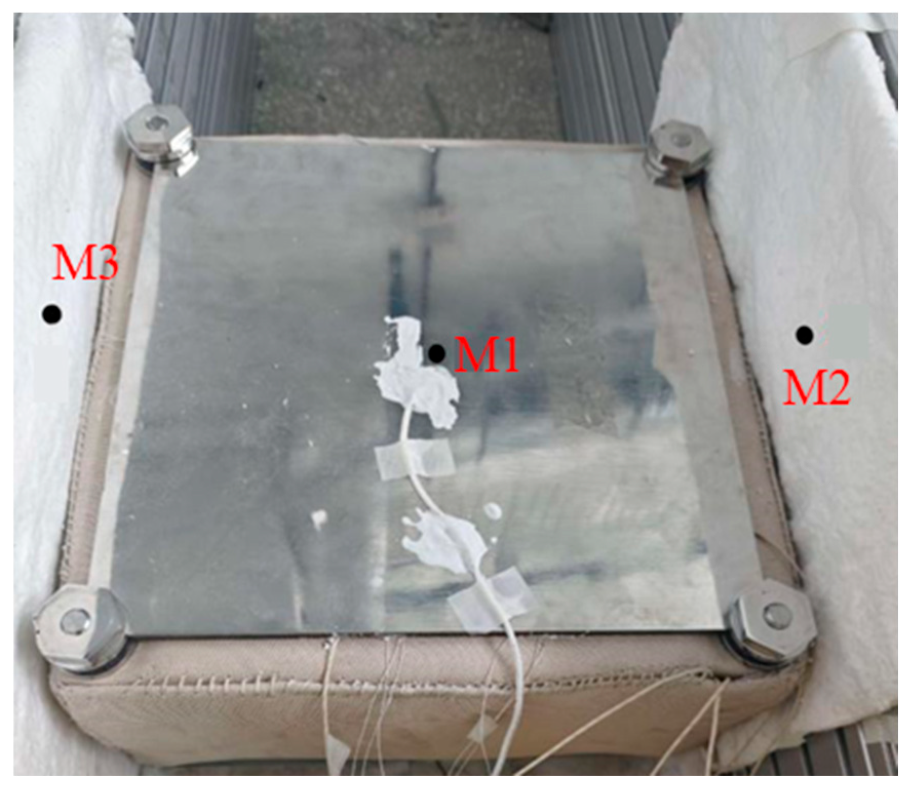 The specimen is placed beneath the matrix quartz lamp, positioned between the left and right support brackets. The insulation cotton is wrapped around the specimen to minimize the heat dissipation and to protect the support bracket. Additionally, six K-type thermocouples, constructed from a nickel–chromium/nickel–aluminum alloy and capable of measuring temperatures in the range of −40 °C to 704 °C, are installed. Among these, three thermocouples, numbered M1–M3, are mounted on the surface of the protective plate, the right support bracket, and the left support bracket, respectively, to monitor whether the temperature evolution follows the expected pattern, as shown in Figure 19. The remaining three thermocouples, numbered T1–T3, are embedded along the thickness direction of the insulation layer to measure the through-thickness temperature, as shown in Figure 20, corresponding to points 1–3 described in Section 3.4.