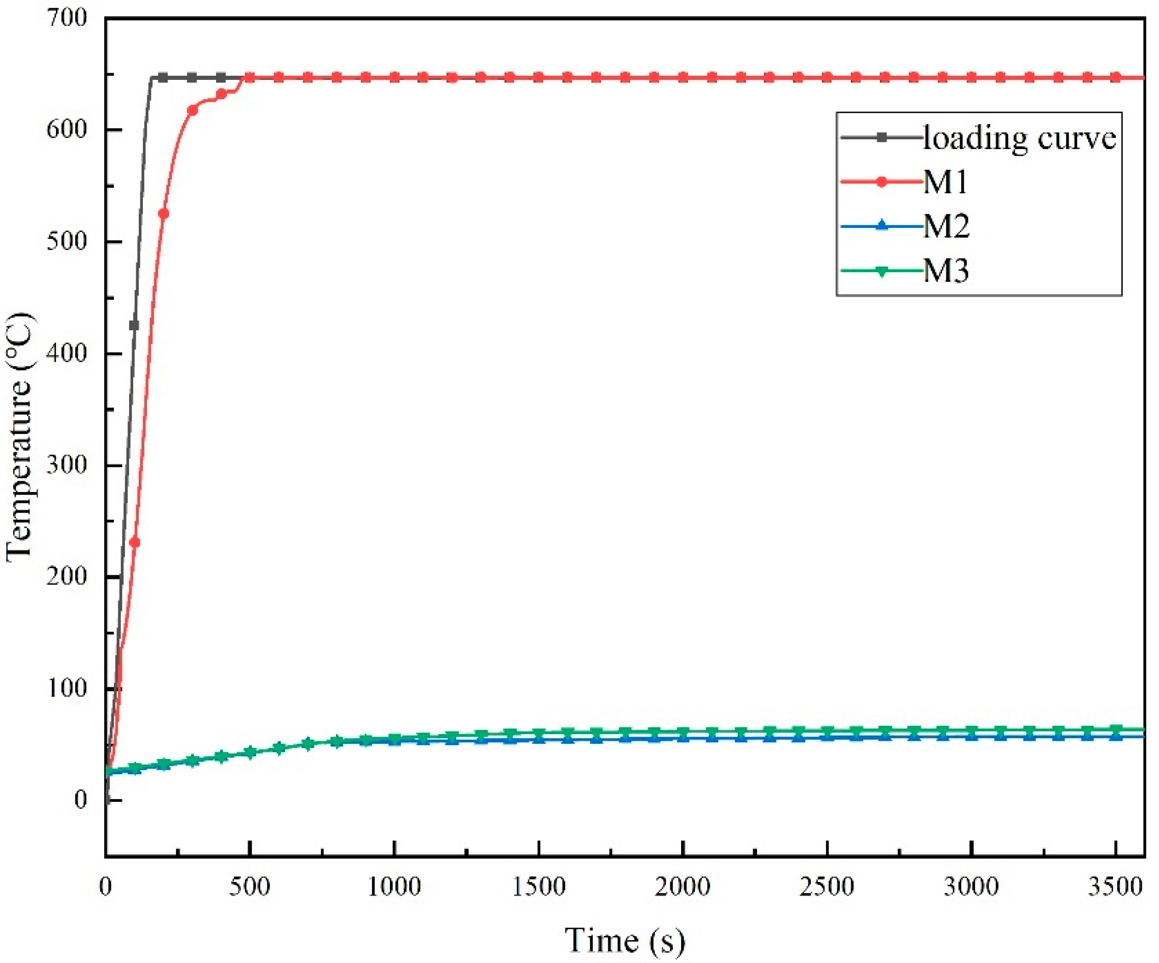 During the experiment, the maximum target temperature and heat rate are set as 647 °C and 3 °C/s, respectively. The temperature loading profile of the experimental platform, together with the recording temperature histories of the monitoring points, i.e., M1–M3, is presented in Figure 21. The temperature histories of the embedded measurement points, i.e., T1–T3, are shown in Figure 22.