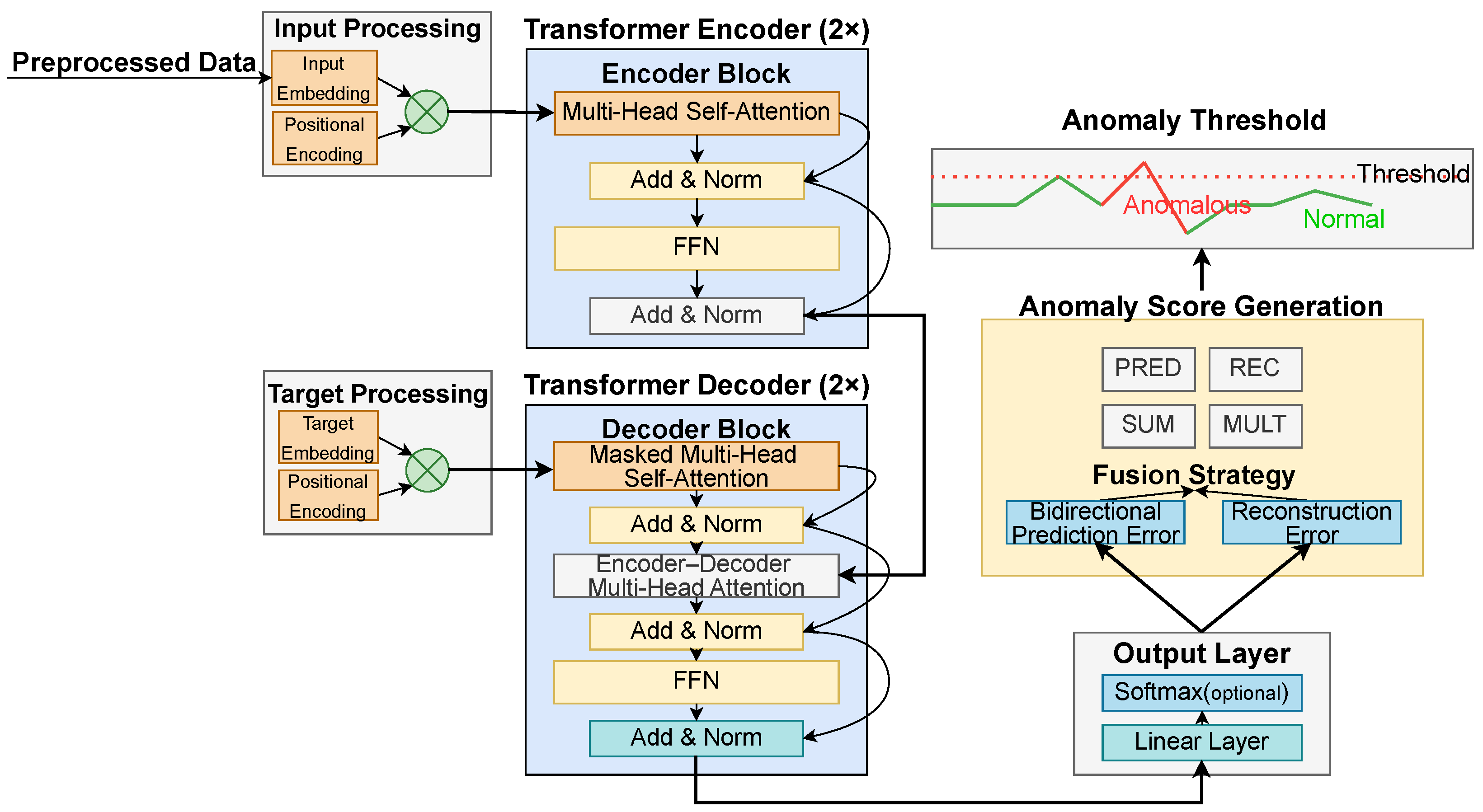 This section presents the system modeling of the proposed unsupervised network-traffic anomaly detection framework. We first describe how raw multivariate traffic is aggregated, cleaned, normalized, and transformed into fixed-length windows suitable for temporal modeling. We then introduce the Transformer-autoencoder architecture used to learn normal temporal patterns, including the encoder–decoder structure and the dual prediction–reconstruction design. Finally, we formulate the training objective, which jointly optimizes forward and backward prediction together with sequence reconstruction to capture both short-term fluctuations and long-range dependencies in network traffic.