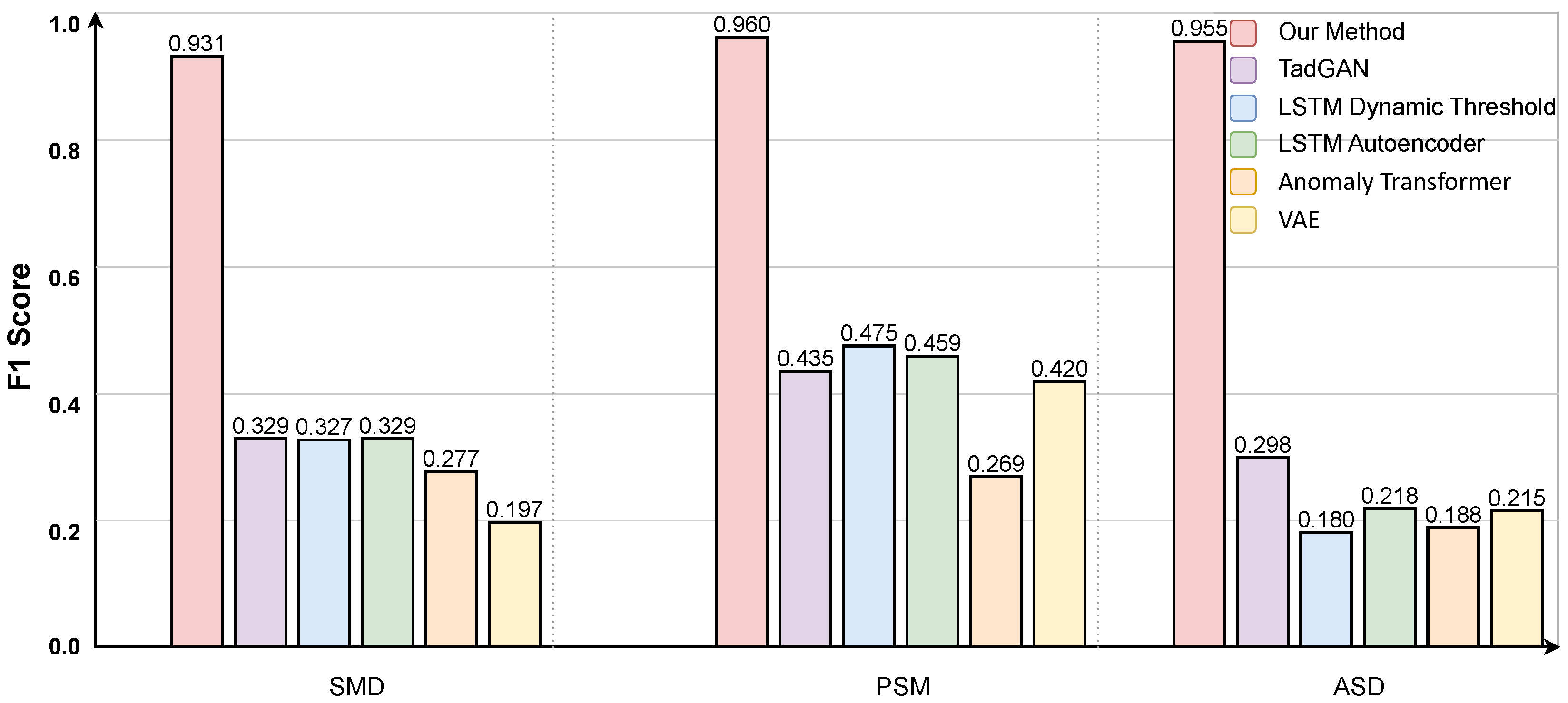Figure 4 compares the F1 scores of all methods on the SMD, PSM, and ASD datasets. The proposed model consistently achieves the highest F1 score on all three benchmarks, reaching 0.931, 0.960, and 0.955 respectively, while the best competing baseline remains below 0.48 on SMD and PSM and below 0.30 on ASD. This large margin indicates that the proposed framework is better at capturing discriminative patterns in multivariate network traffic, and can maintain stable detection performance across different domains and anomaly types. The advantage mainly comes from the multi-head self-attention mechanism and positional encoding, which allow the model to capture long-range temporal dependencies and cross-feature interactions in parallel, thereby modeling both bursty collaboration among multiple IP addresses and gradual distribution shifts over long sequences.