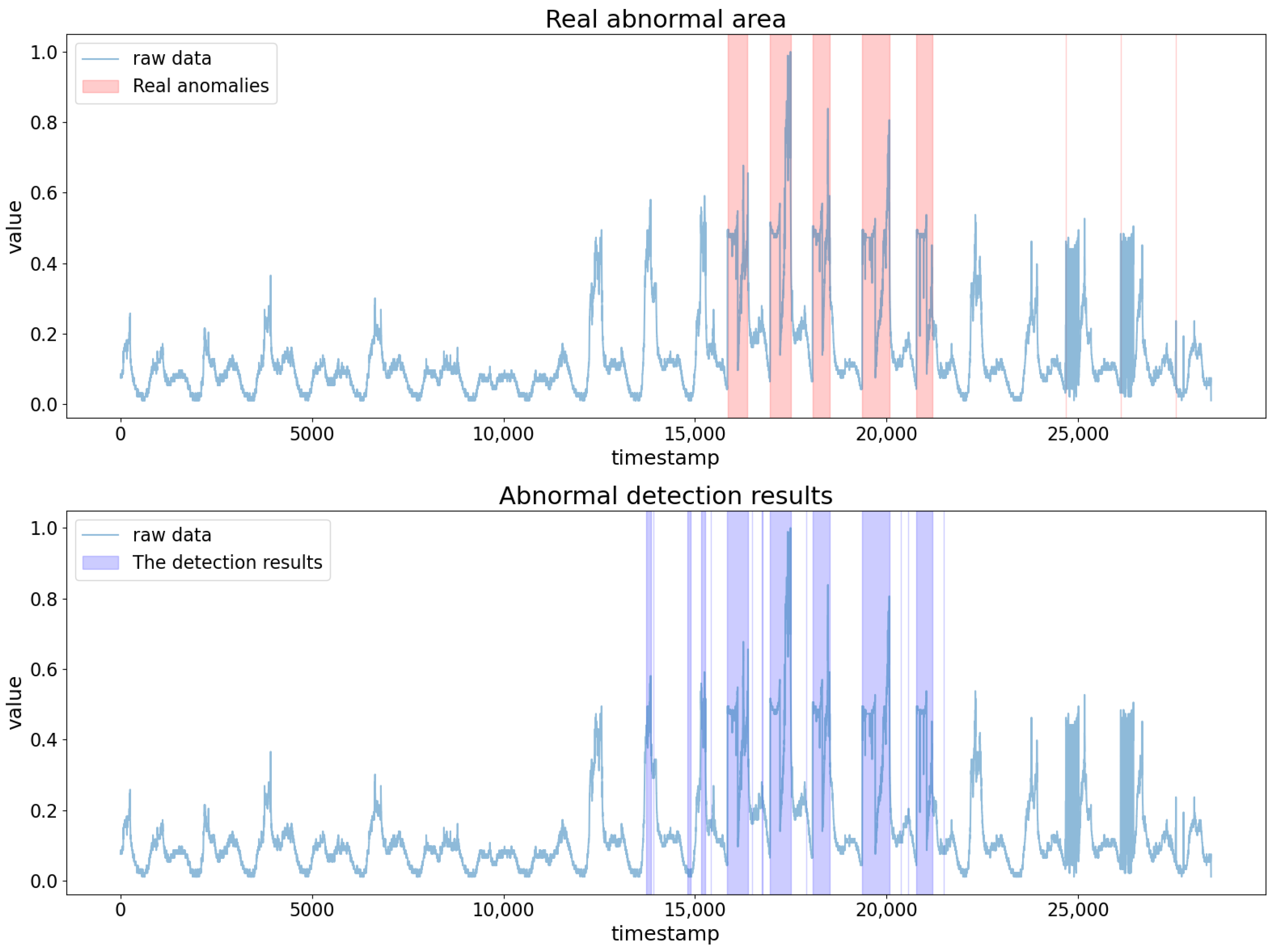 Figure 5 visualizes a representative SMD time series, where the upper panel highlights the true abnormal regions and the lower panel overlays the filtered detection results.
