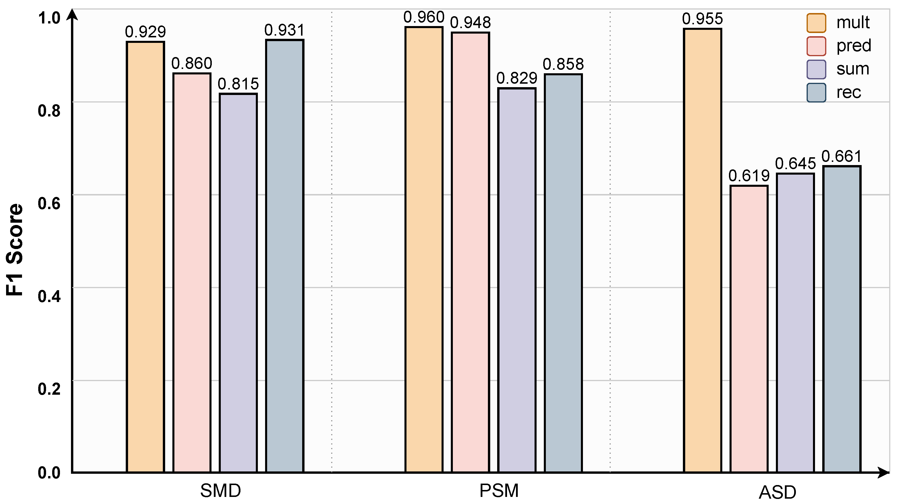 Figure 6 compares the four anomaly-score fusion strategies, MULT, PRED, SUM, and REC, across the SMD, PSM, and ASD datasets. On SMD, REC achieves the highest F1 score, with MULT very close behind, while PRED and SUM are noticeably lower. On PSM, MULT clearly dominates, followed by PRED, whereas SUM and REC lag by a considerable margin. On ASD, the gap between strategies becomes even more pronounced: MULT attains the best F1 score by a large margin, and all three alternatives (PRED, SUM, REC) perform substantially worse and relatively close to one another. Overall, the bar chart indicates that MULT is the consistently strongest strategy across datasets, presenting that the overall gains are not tied to a single ad hoc choice but are supported by a systematic comparison.
