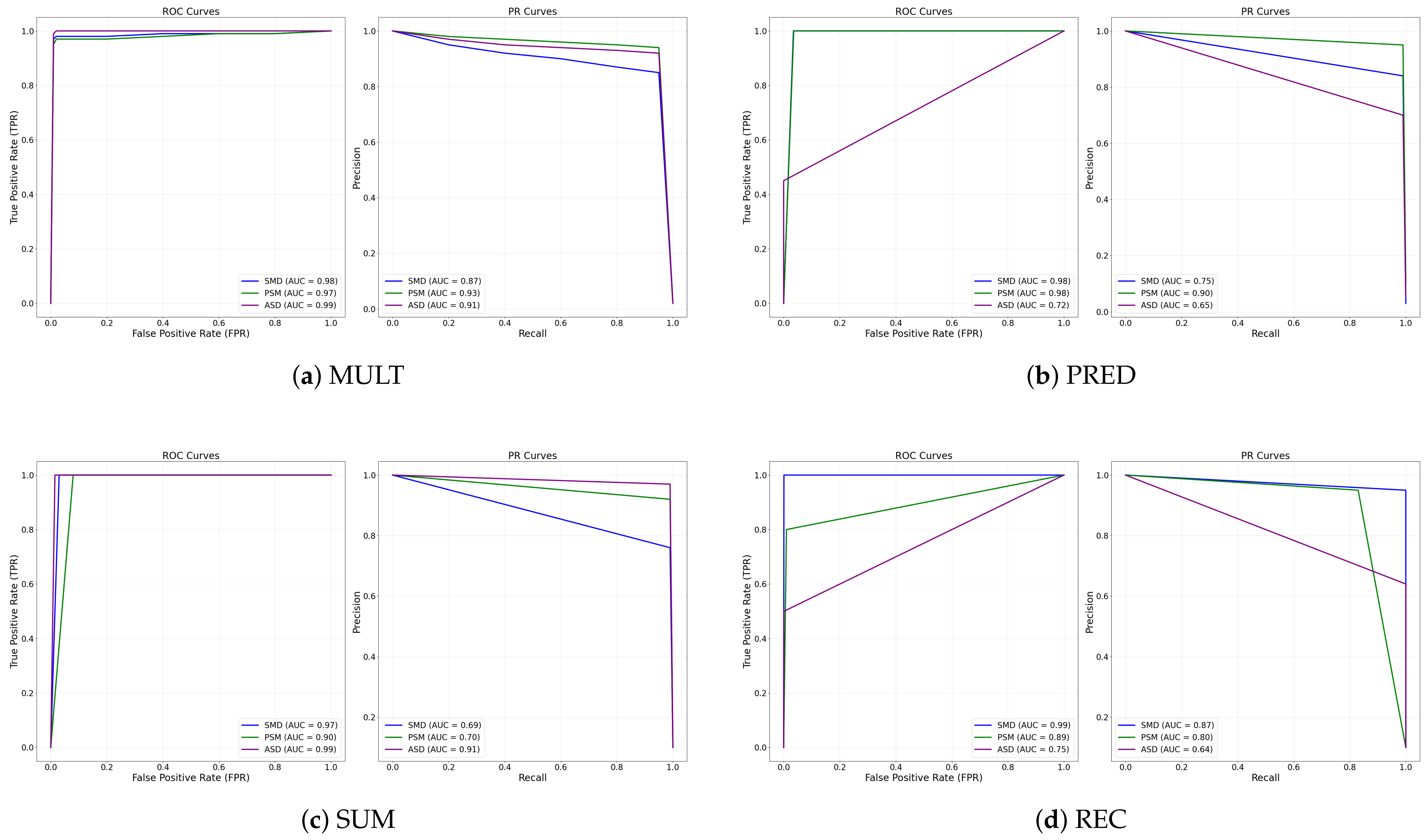 Figure 7b, the ROC curves for SMD and PSM remain strong, but the ASD ROC curve flattens considerably, and the PR curves drop more quickly with increasing recall, particularly on SMD and ASD, indicating a sharper precision-recall trade-off and a higher proportion of false alarms when the decision threshold is relaxed. For SUM in