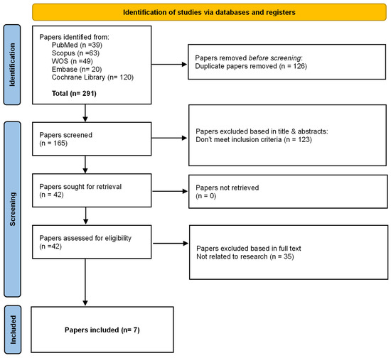 Flow diagram illustrates the identification, screening, eligibility assessment, and inclusion of systematic reviews in this umbrella review. Database searches yielded 291 records (PubMed, Scopus, Web of Science, Embase, and Cochrane Library). After removal of 126 duplicates, 165 records were screened by title and abstract, resulting in the exclusion of 123 records that did not meet the inclusion criteria. Forty-two full-text articles were assessed for eligibility, of which 35 were excluded for not being related to the research question. Seven systematic reviews fulfilled all predefined inclusion criteria and were included in the final qualitative synthesis.