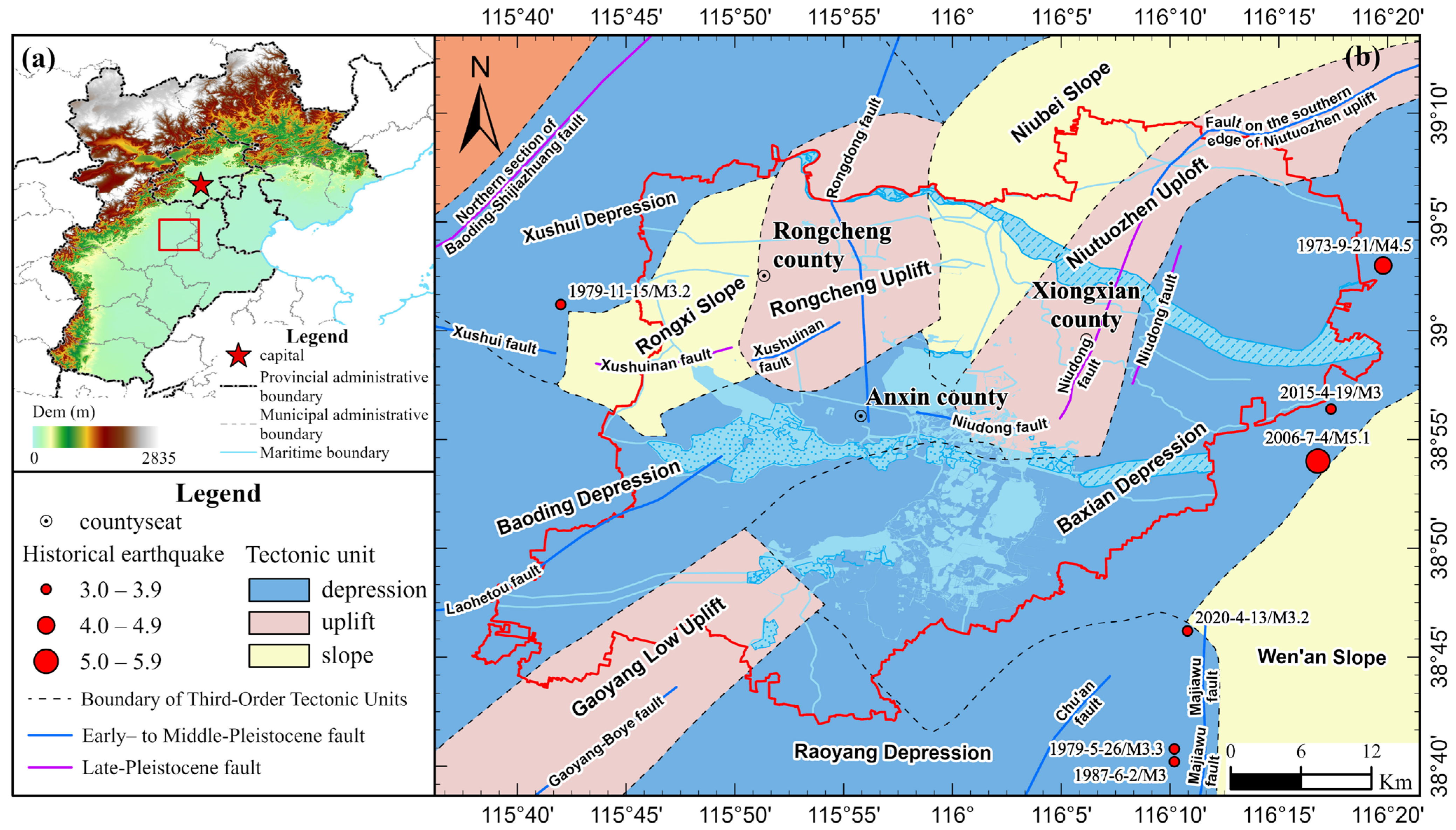 - Yang, B.; Qin, S.; Xue, L.; Wu, X.; Zhang, K. Seismic hazard assessment in the Xiongan New Area. Chin. J. Geophys. 2017, 60, 4644–4654. [Google Scholar] [CrossRef]