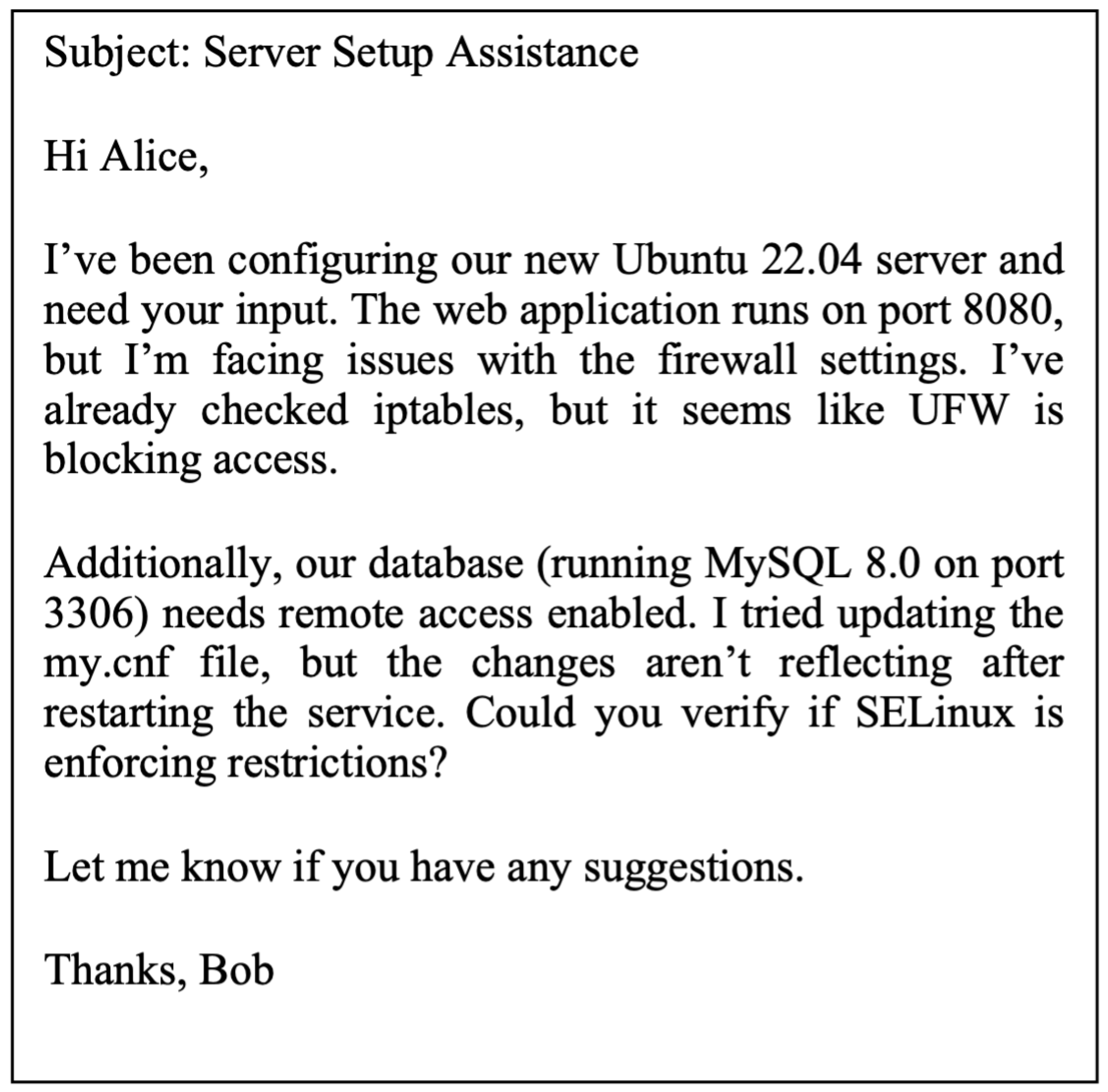 Figure 1: an internal e-mail sent by Bob to Alice via the organization’s corporate communication system. This example typifies the type of interaction that is targeted for analysis in this study.