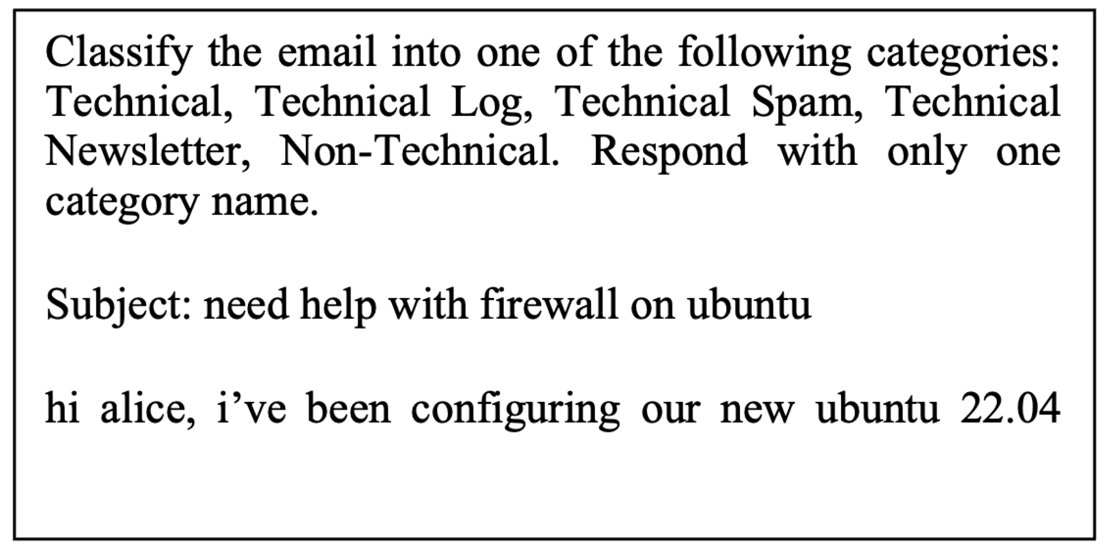 The example illustrates the two central components of the problem: (1) distinguishing technical e-mails from nontechnical ones and (2) extracting structured, actionable insights from technical content. This structured information can be used effectively to build knowledge bases or link to existing ontologies. From a mathematical perspective, the task can be described in two stages. Given a set of e-mails , each e-mail is first mapped to a label , where denotes technical relevance. The classification model is trained to minimize the classification loss . For each message labeled as technical, a secondary function extracts entities representing relevant technical components such as software, hardware, or configurations.