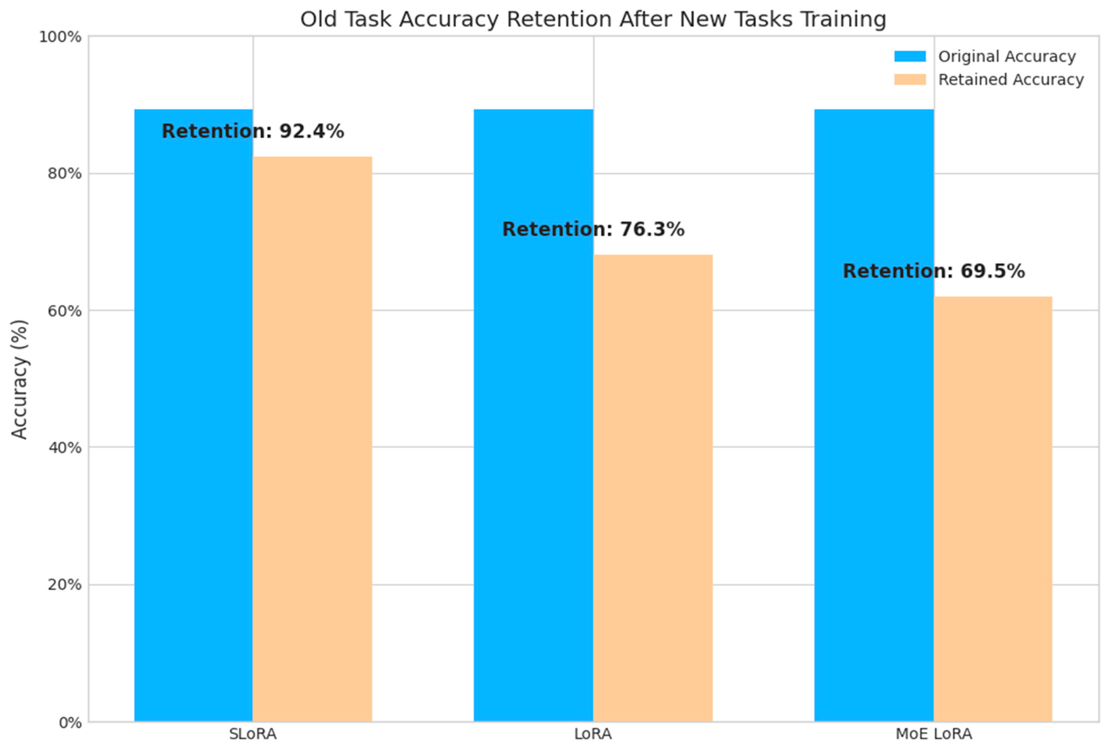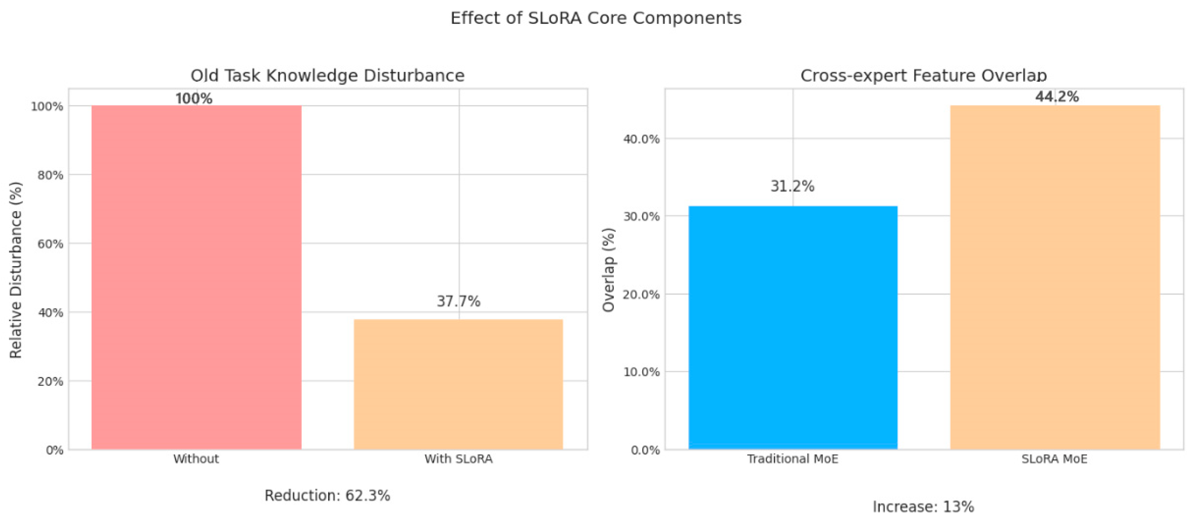 Table 1 that SLoRA takes “orthogonal constraint optimization and optimization of MoE structure (covering general experts, task-specific experts and dynamic routing)” as its core content. Compared with the “low rank matrix decomposition and freezing pretraining parameters” of traditional LoRA, on the one hand, it solves the design limitations of LoRA single task optimization (including poor adaptability to multiple tasks, lack of knowledge forgetting mitigation mechanism, etc.); on the other hand, it improves the knowledge integration ability by means of the cross-expert attention mechanism, reduces the interference generated by old knowledge through the initialization of the constraint solution space, and ultimately achieves an increase of 7.8% in the average accuracy rate of multiple tasks and 92.4% in the accuracy rate of old tasks (16.1% higher than LoRA). Task switching loss is only 2.3%; compared with LoRA, the results are 6.4 percentage points lower and maintain a super low computational cost situation (the proportion of trainable parameters is only 0.8%).
