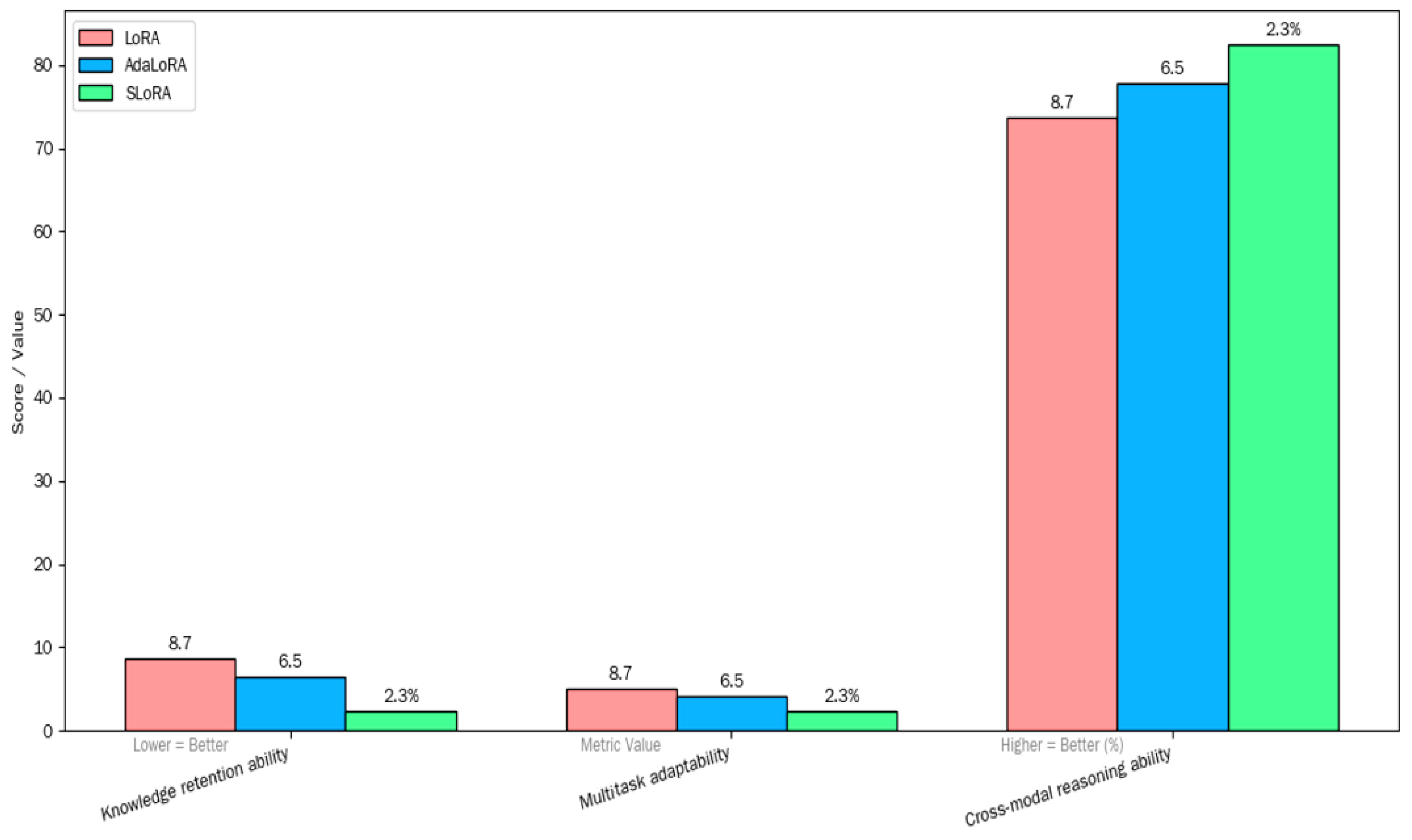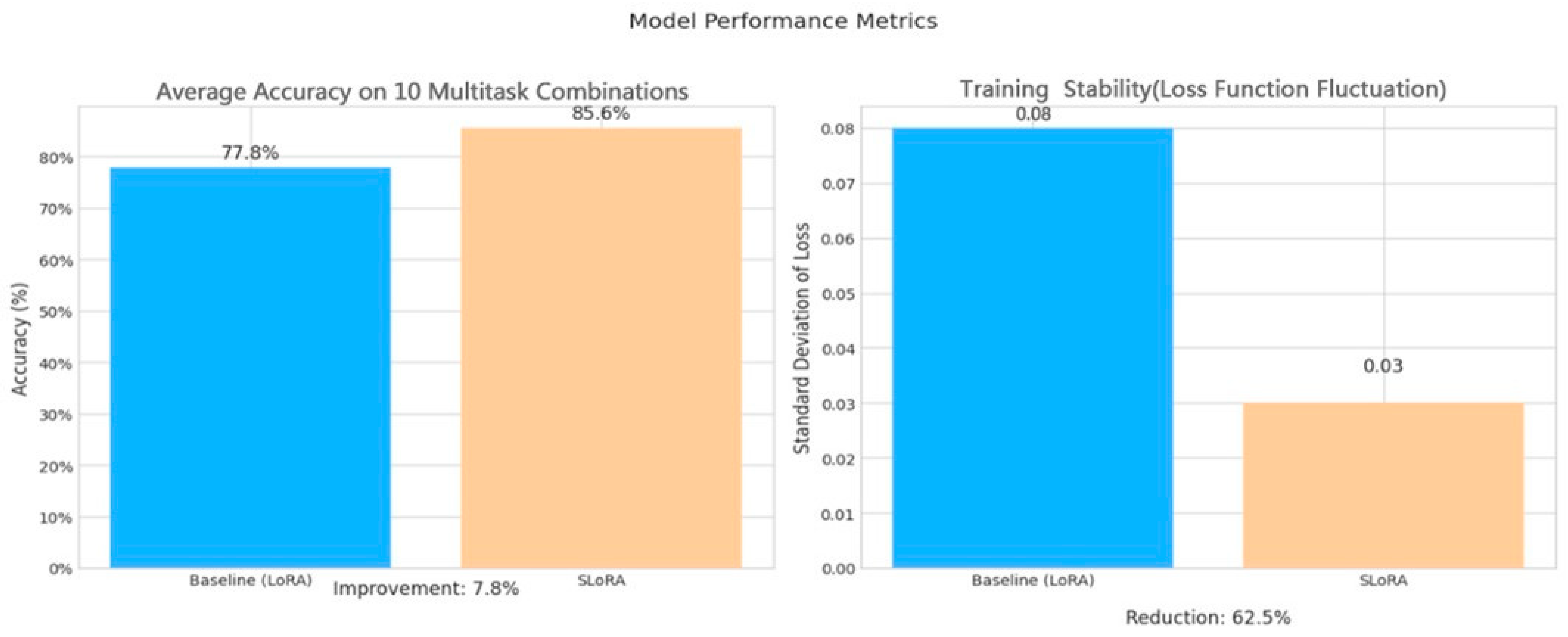 Figure 9, it can be observed that SLoRA utilizes “orthogonal constraints to implement optimization operations + reshape the MoE architecture (covering general domain expert modules, task-specific expert units, and dynamic path planning mechanisms)”. On the one hand, it addresses the difficulties faced by traditional LoRA and AdaLoRA in multitasking environments, such as weak knowledge retention efficiency, insufficient task adaptation, and low cross-modal fusion rate. On the other hand, it reduces the interference effects of existing knowledge through orthogonal constraints and enhances the adaptability to tasks through dynamic routing. Ultimately, it achieves a significant breakthrough in three key levels—knowledge retention level (the loss caused by task switching is only 2.3%, which is 6.4 percentage points lower than LoRA), numerical value, and multitask adaptation status (related indicator is 2.3, far higher than LoRA). The corresponding 5.1 indicator value and cross-modal reasoning level (accuracy of 82.4%, 8.8 percentage points higher than LoRA) fully demonstrate its overall advantageous characteristics in multitasking application scenarios.