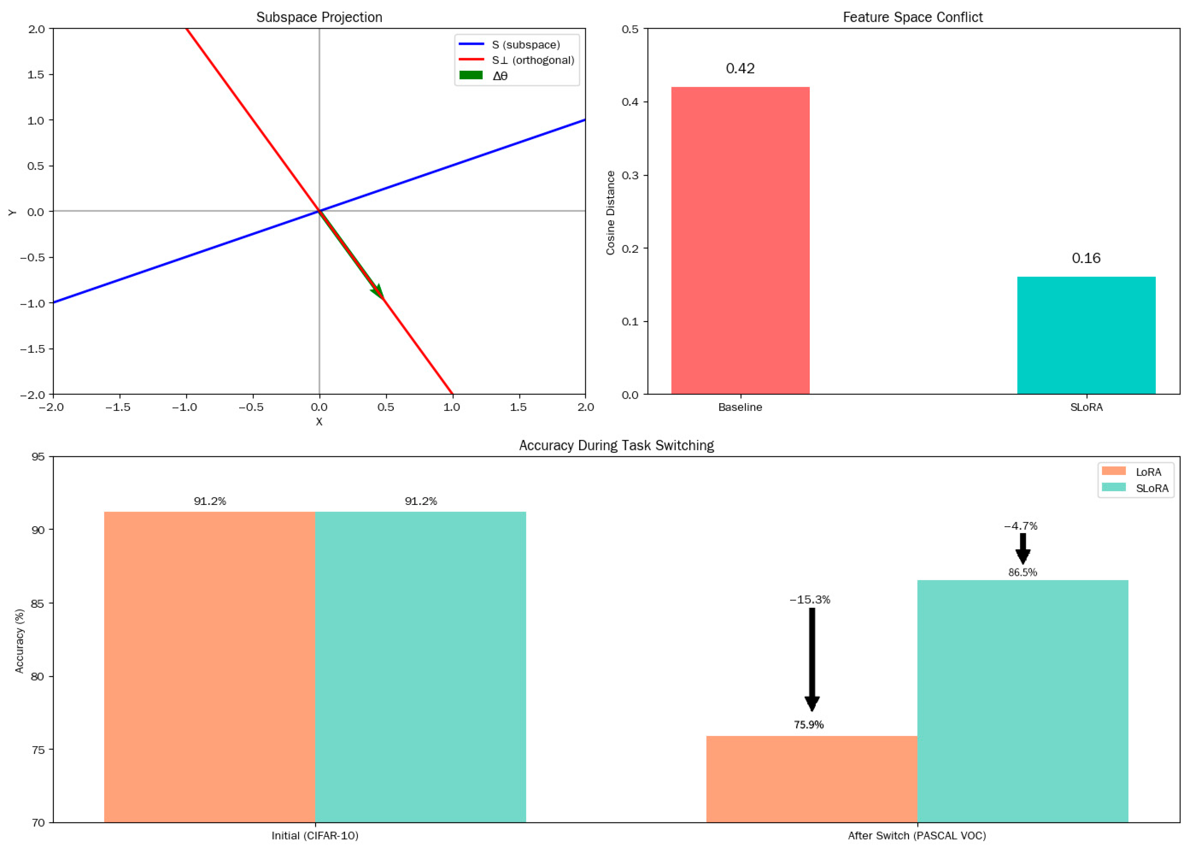 Table 12, it was found that SLoRA has a high retention rate of 91.2%–94.8% for the accuracy of old tasks in different task sequence architectures (covering NLP, CV, and cross-modal categories). The loss caused by task switching is only in the range of 2.3%–4.7%. The amplitude of parameter perturbations (±0.03–±0.05) and the degree of feature space conflicts (0.12–0.16) are significantly lower than those of LoRA and AdaLoRA, effectively alleviating and suppressing catastrophic forgetting phenomena in multitask learning processes and enhancing cross-task knowledge transfer capabilities.