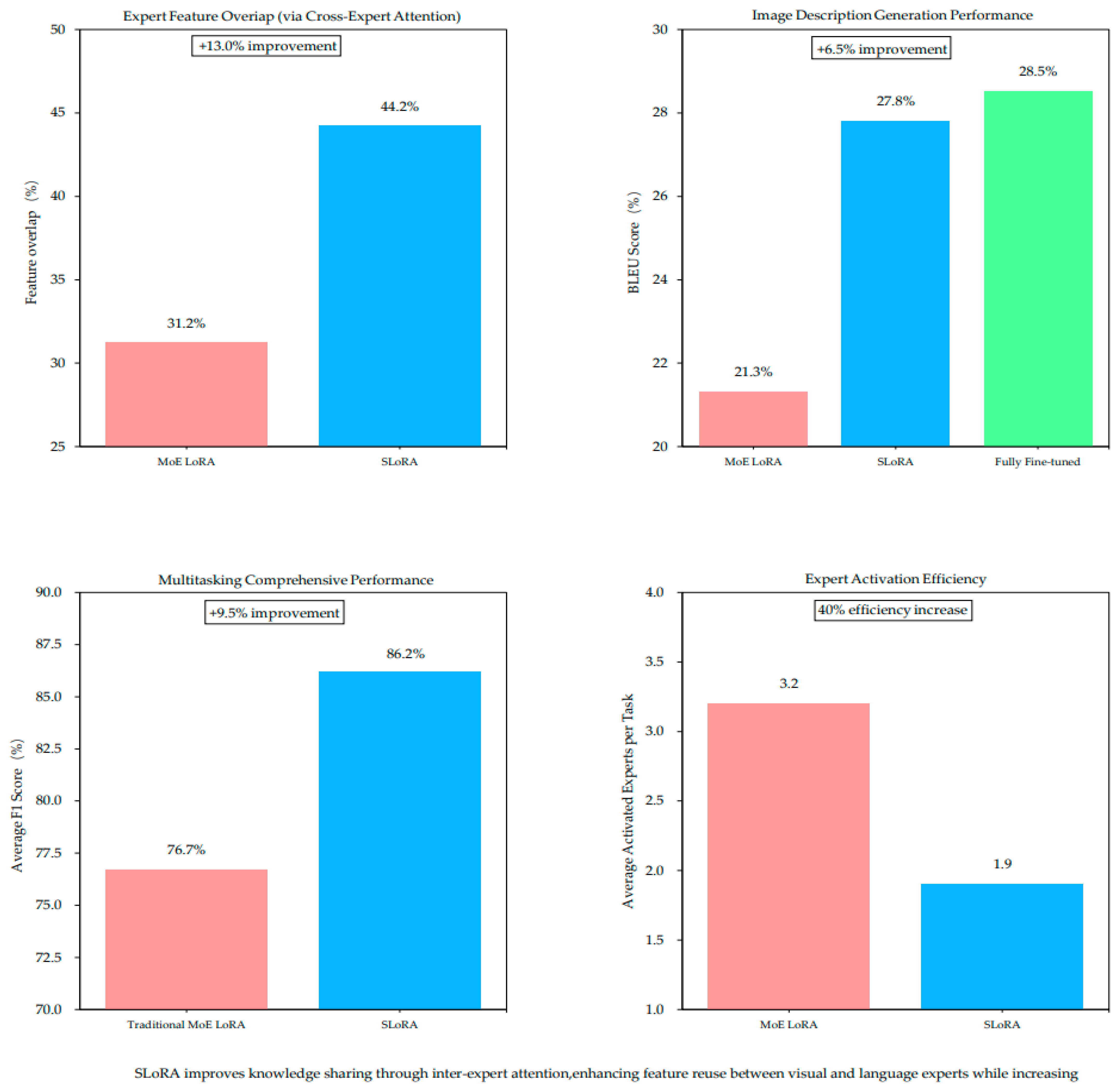 In the context of knowledge fragmentation, insufficient information sharing among experts leads to knowledge dispersion and limited cross-task performance. According to the calculation of feature cosine similarity, the overlap of different expert features in MoE LoRA is only 31.2% (the whole model is fine-tuned to 68.5%), and the feature similarity between language experts and visual experts is only 22.7%, resulting in a 15.3% lower accuracy of cross-modal tasks than the theoretical value. The peculiar case shows that in the “Image Description Generation” task, the accuracy of object recognition by visual experts reached 90.1%, and the BLEU (Bilingual Evaluation Understudy) value of text generation by language experts reached 28.6%. However, due to information isolation, the BLEU value of the fused task was just 21.3%, which is 25.5% lower than the ideal state of expert collaboration. In addition, the degree of expert specialization is positively correlated with knowledge fragmentation. When the number of experts increases from 8 to 32, the average F1 score of multitasking decreases by 4.8%, and the feature overlap reduces by 12.3%. These challenges have led to significant performance fluctuations in MoE LoRA in multitasking scenarios, with a performance standard deviation of 5.7 (SLoRA of 2.3) in 10 task combination tests, and particularly poor performance in cross-domain tasks, such as a 27.4% decrease in accuracy when switching from text classification to image segmentation.