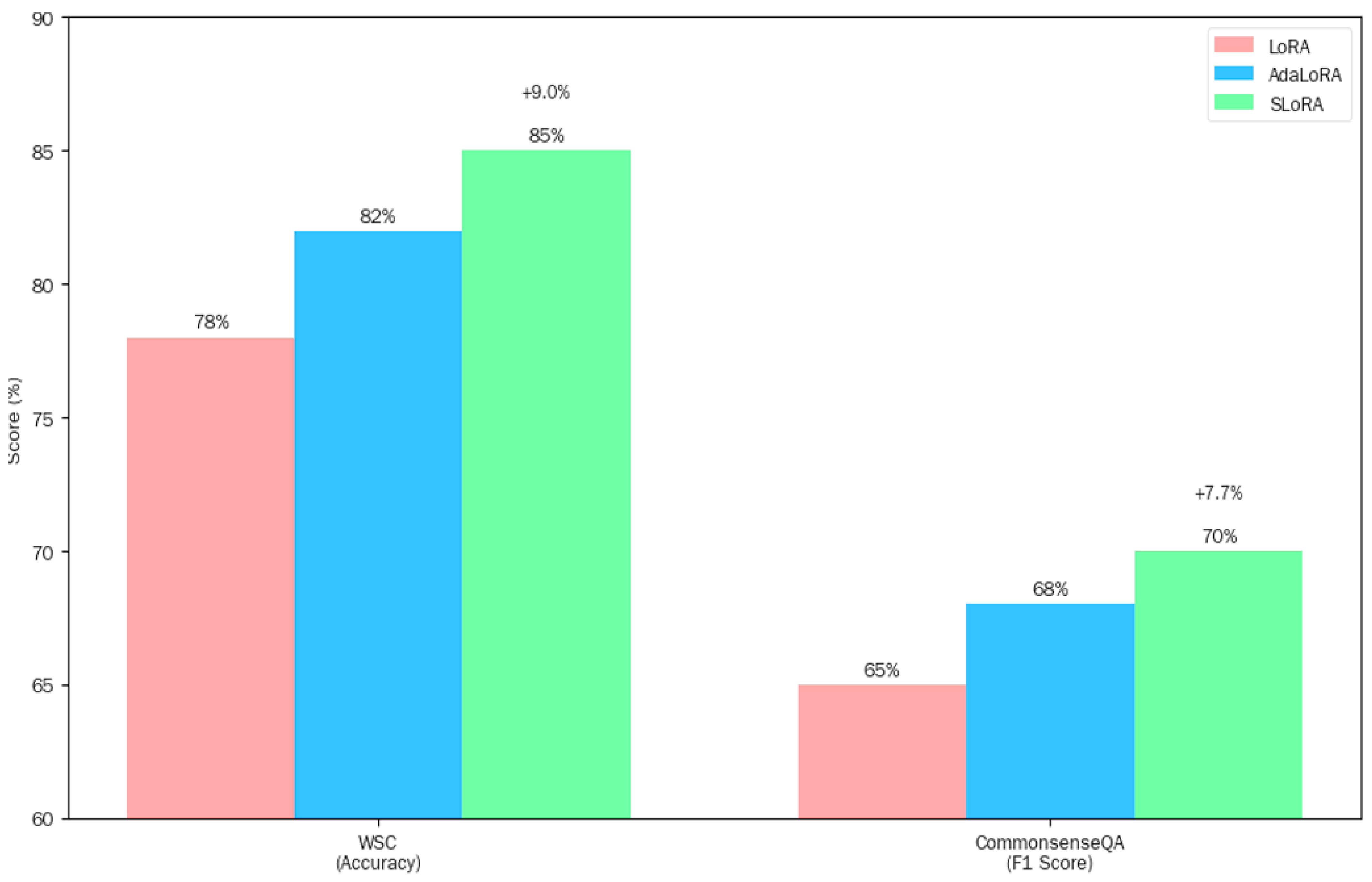 SLoRA, which demonstrates excellent performance in commonsense reasoning tasks, achieved significantly higher accuracy and F1 score on multiple commonsense reasoning datasets compared to LoRA, AdaLoRA, and other comparative methods, with clear quantitative advantages: on the WSC dataset of SuperGLUE, its accuracy is 9.0% higher than LoRA and 3.7% higher than AdaLoRA; on the CommonsenseQA dataset, its F1 score is 7.7% higher than LoRA and 2.9% higher than AdaLoRA.