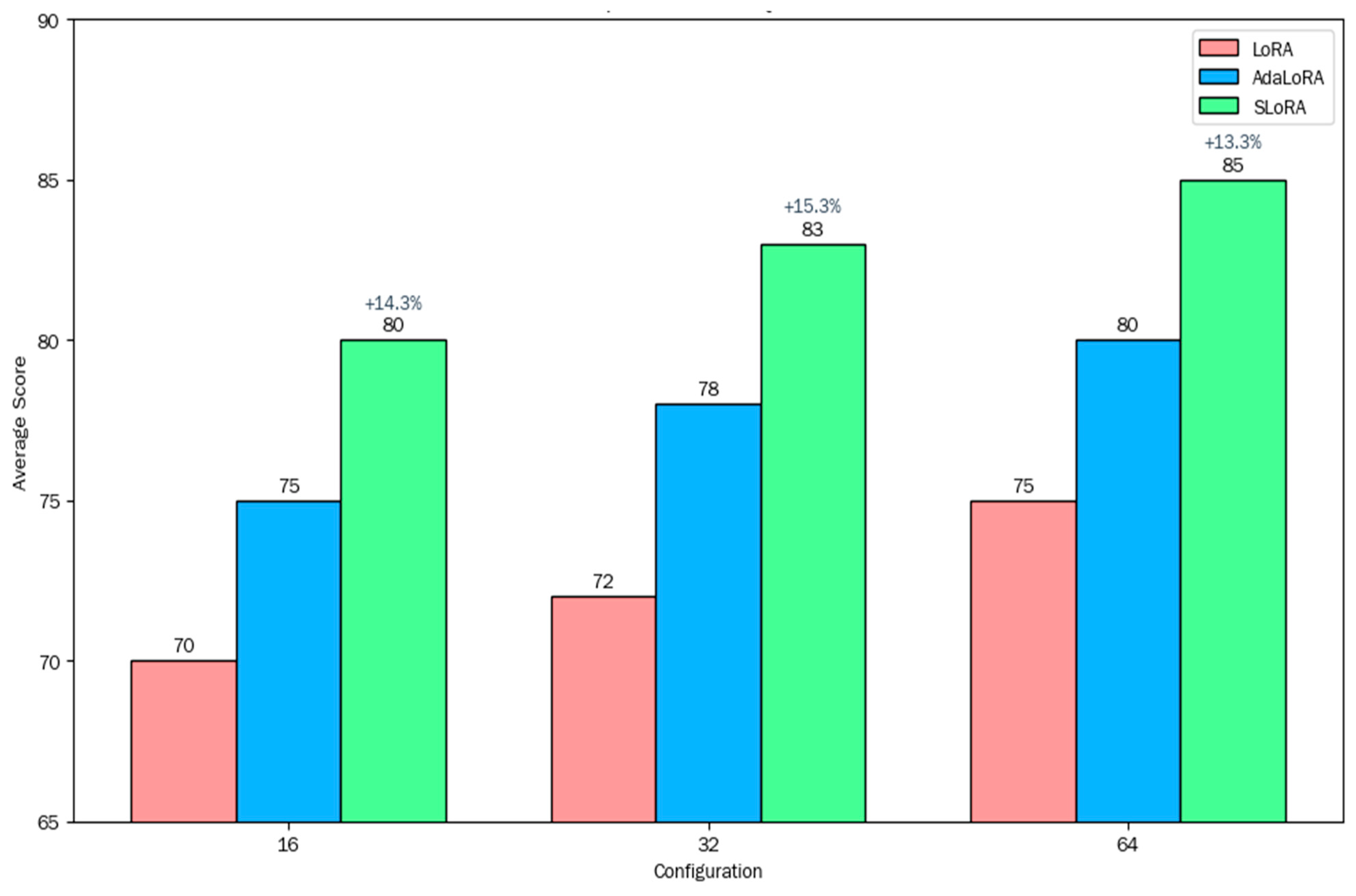 Table 5, SLoRA performs outstandingly in commonsense reasoning tasks: the accuracy of the WSC dataset reaches 85%, which is 9.0% higher than LoRA (78%) and 3.7% higher than AdaLoRA (82%); the F1 value of the CommonsenseQA dataset reaches 70%, which is five and two percentage points higher than LoRA and AdaLoRA, respectively, verifying its adaptability to complex semantic reasoning compared to LoRA. The SLoRA, which performed well on the IconQA multimodal dataset, had significantly higher average scores than the baseline method under different LoRA rank settings (16, 32, 64). When the rank was 16, the average score of SLoRA reached 80 points, compared to LoRA which only scored 70 points and AdaLoRA which scored 75 points; when the rank was 32, the average score of SLoRA increased to 83 points, while LoRA and AdaLoRA were 72 and 78 points, respectively; when the rank was 64, the average score of SLoRA remained stable at 85 points, while LoRA and AdaLoRA were 75 and 80 points, respectively. This fully demonstrates the powerful ability of SLoRA in multimodal information fusion and cross-modal reasoning, which can better understand and process combined image and text information to accurately answer relevant questions. Moreover, its average score is significantly ahead under different LoRA rank (r = 16, 32, 64) settings, as shown in the following table.