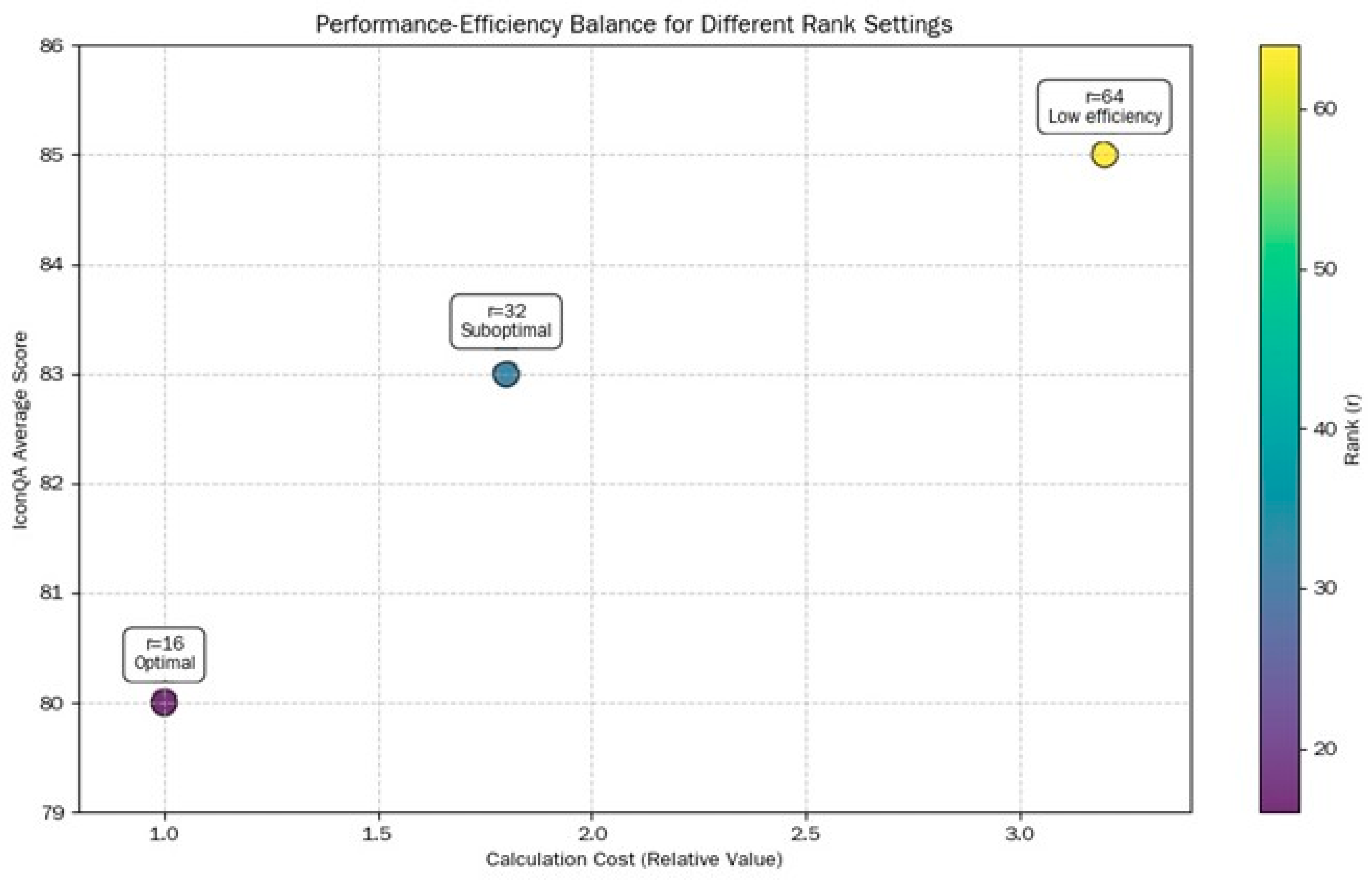Figure 10, it can be seen that SLoRA, with its “performance and efficiency quantification trade-off mechanism under different rank (r) settings”, not only deals with the problem of “insufficient model expression ability due to low rank values and redundant computational costs due to high rank values”, but also clarifies the optimal configuration through an accurate comparison process. Finally, when it is at the node of r = 16, it achieves the optimal balance between performance and efficiency levels (IconQA average score of 80 points, relative computational cost value of 1.0), while when the values are 32 and 64, the performance only shows a slight improvement trend (with scores of 83 and 85 respectively), but the computational cost shows a sharp increase, reaching as much as 1.8 times and 3.2 times respectively. This situation fully verifies the high efficiency and practicality of low rank settings in multitasking scenarios.