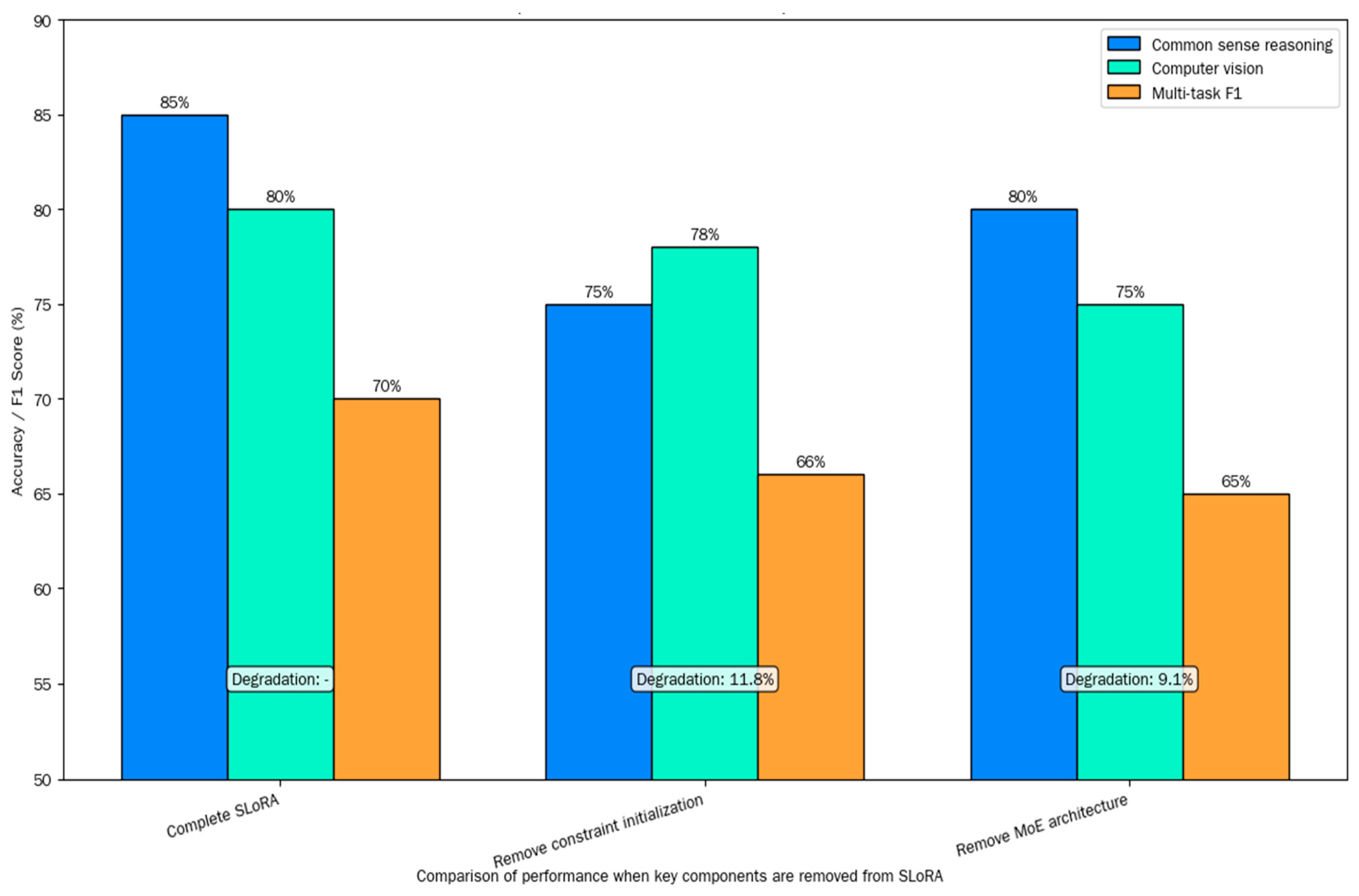Table 13, we conducted a content exploration on the constraint initialization strategy of SLoRA and optimized MoE architecture system, which constitute the core elements of performance. After removing the constraint initialization operation, the accuracy of commonsense reasoning decreased by 10%, the knowledge retention rate decreased to 75.6%, and the performance degraded by 11.8%; after removing the MoE architecture settings, the multitasking F1 value decreased to 65%, resulting in a performance degradation of 9.1%; when removing cross-expert attention mechanisms or dynamic routing settings, it can also cause a decline in performance. This verifies and confirms the key role of dual core components and sub modules in alleviating forgetting problems and improving multitask adaptation performance.