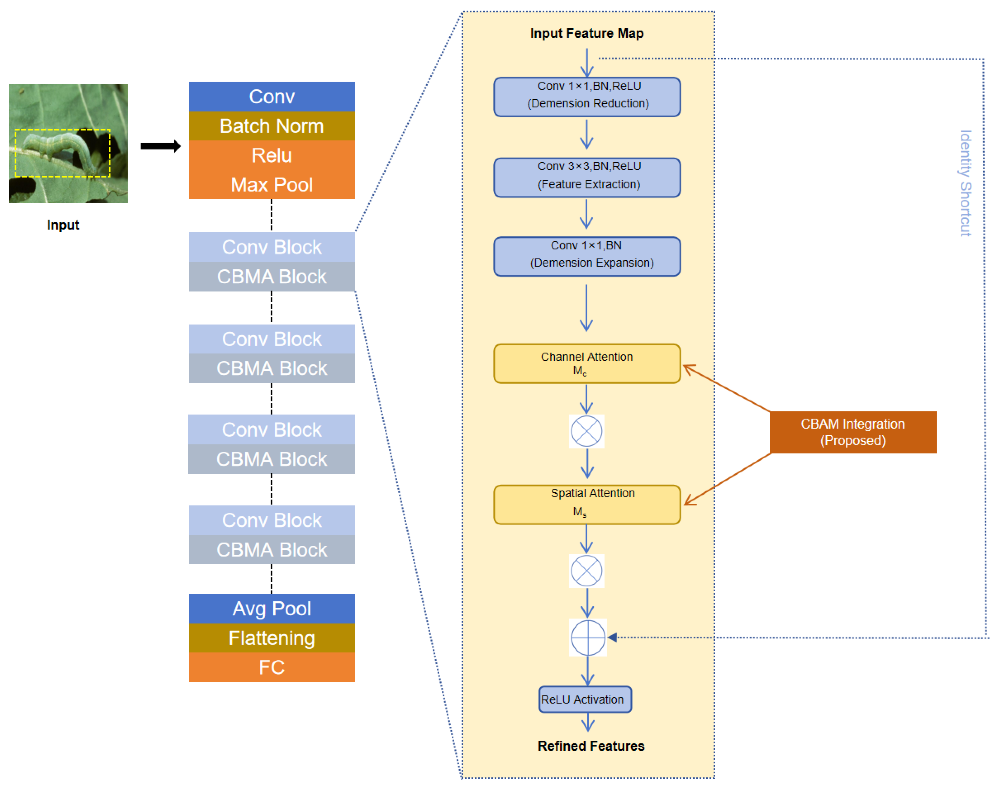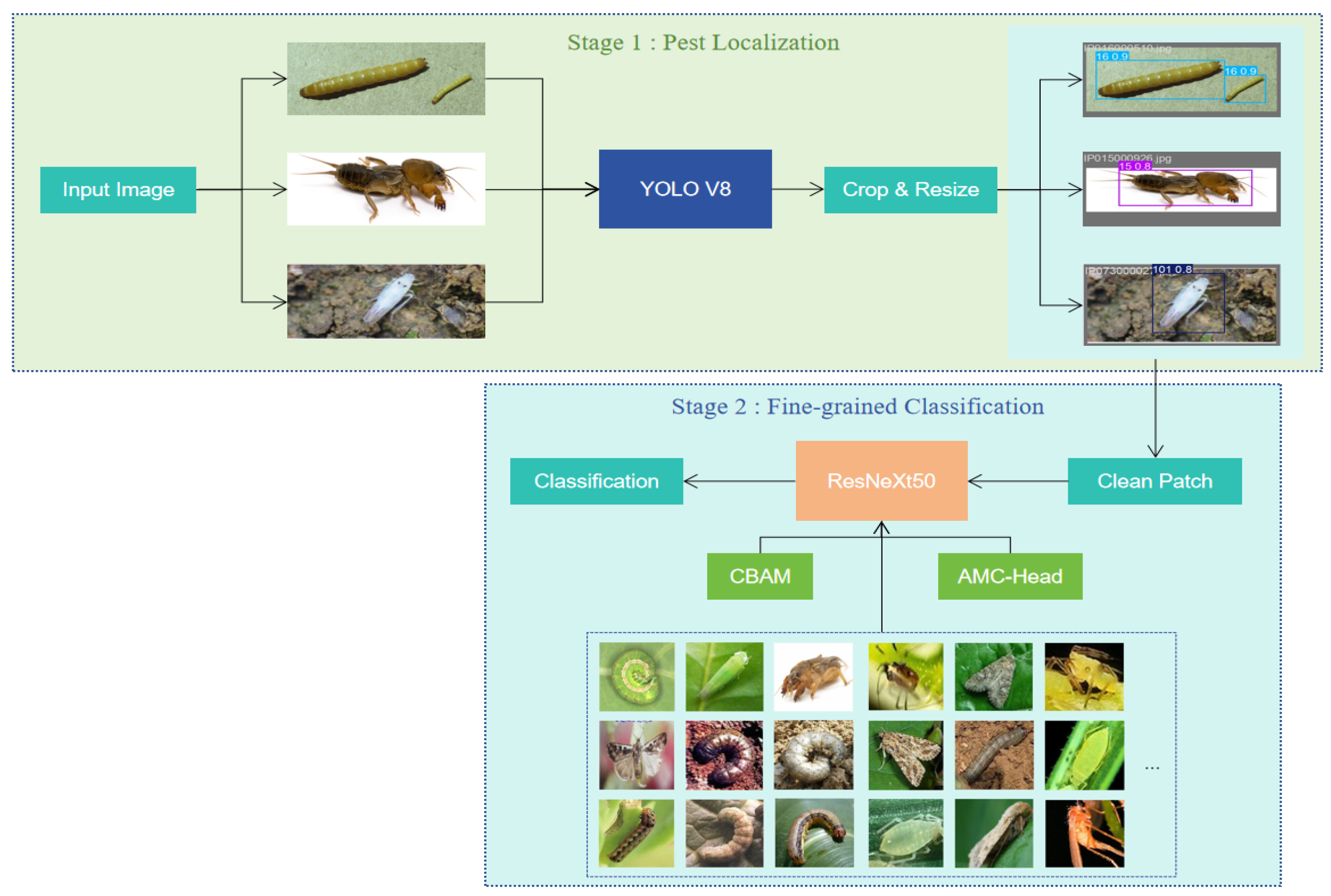 - An improved ResNeXt50 architecture serves as the feature extractor, enhanced by the Convolutional Block Attention Module (CBAM). Crucially, the classification head is redesigned as an Adaptive Multi-Center Head (AMC-Head) to handle multi-state pest morphologies.