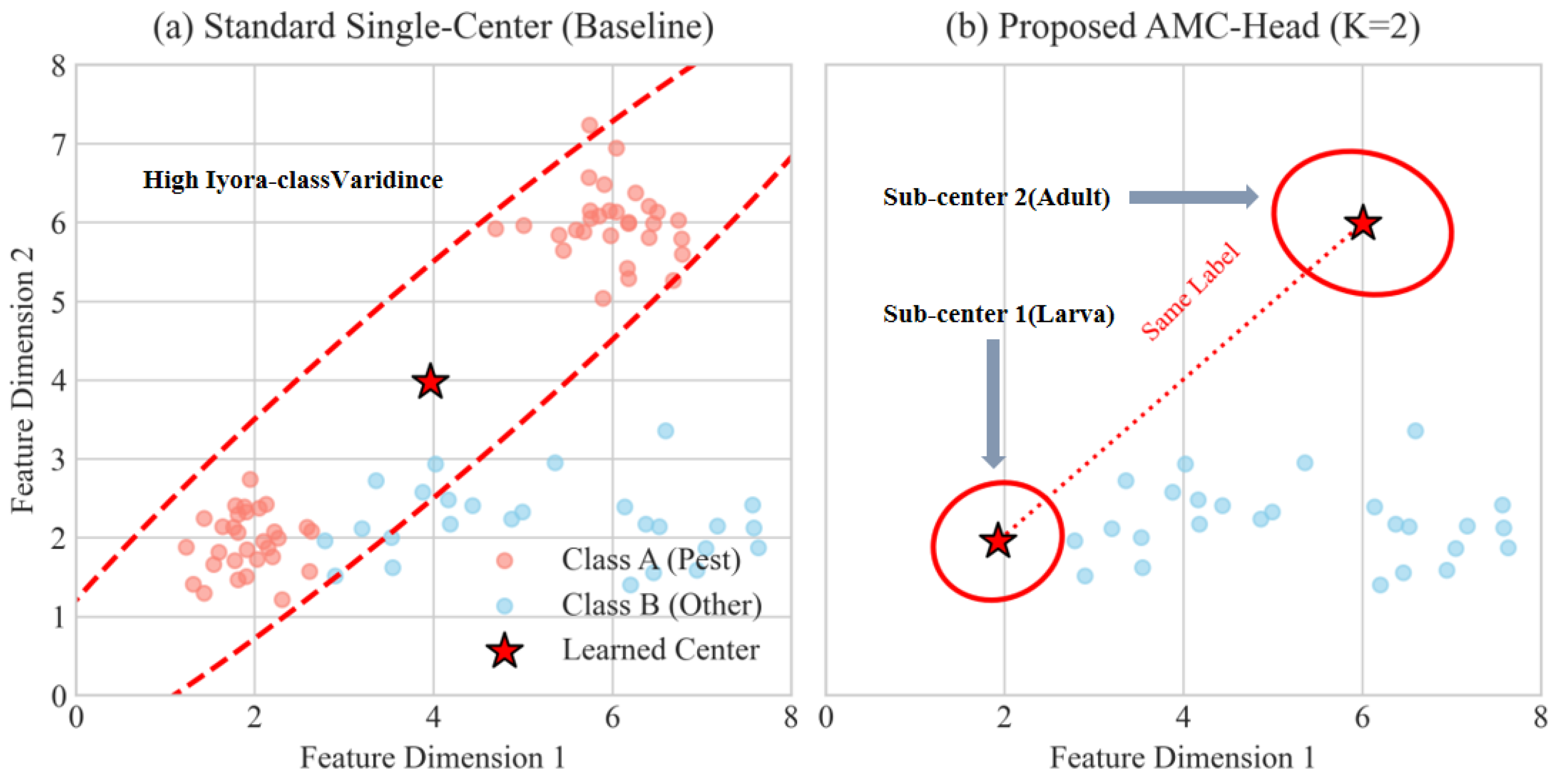 - Effect of Multi-Center Learning (+AMC): Replacing the standard classifier with our AMC-Head yields a final boost of +2.1%. Notably, the F1-score improves disproportionately, suggesting that the multi-center mechanism is particularly effective for balancing precision and recall in complex categories (e.g., pests with high intra-class variance).