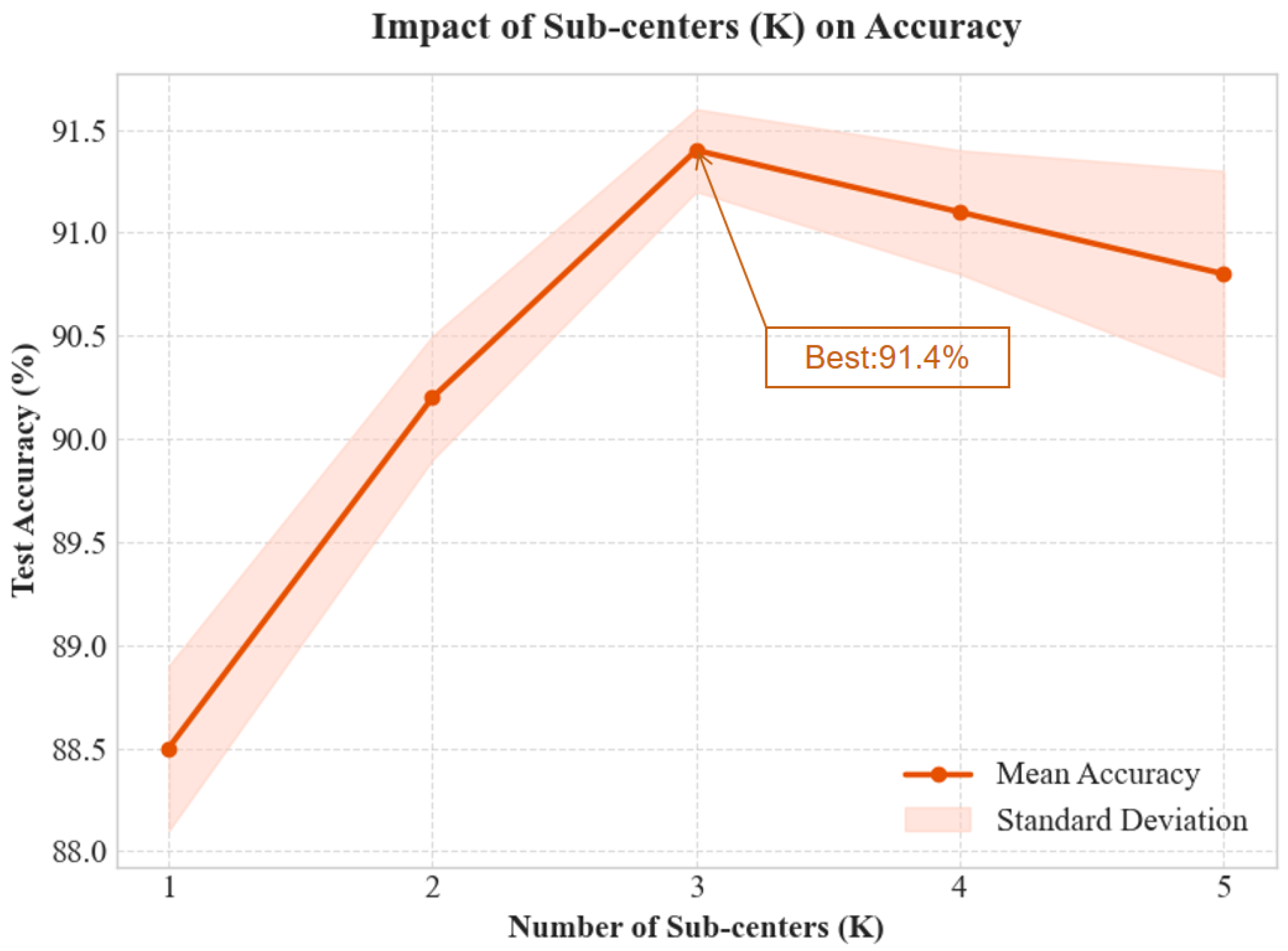 - Increasing K to 4 or 5 leads to diminishing returns and potential overfitting, as the sub-centers become too sparse for the available training data.