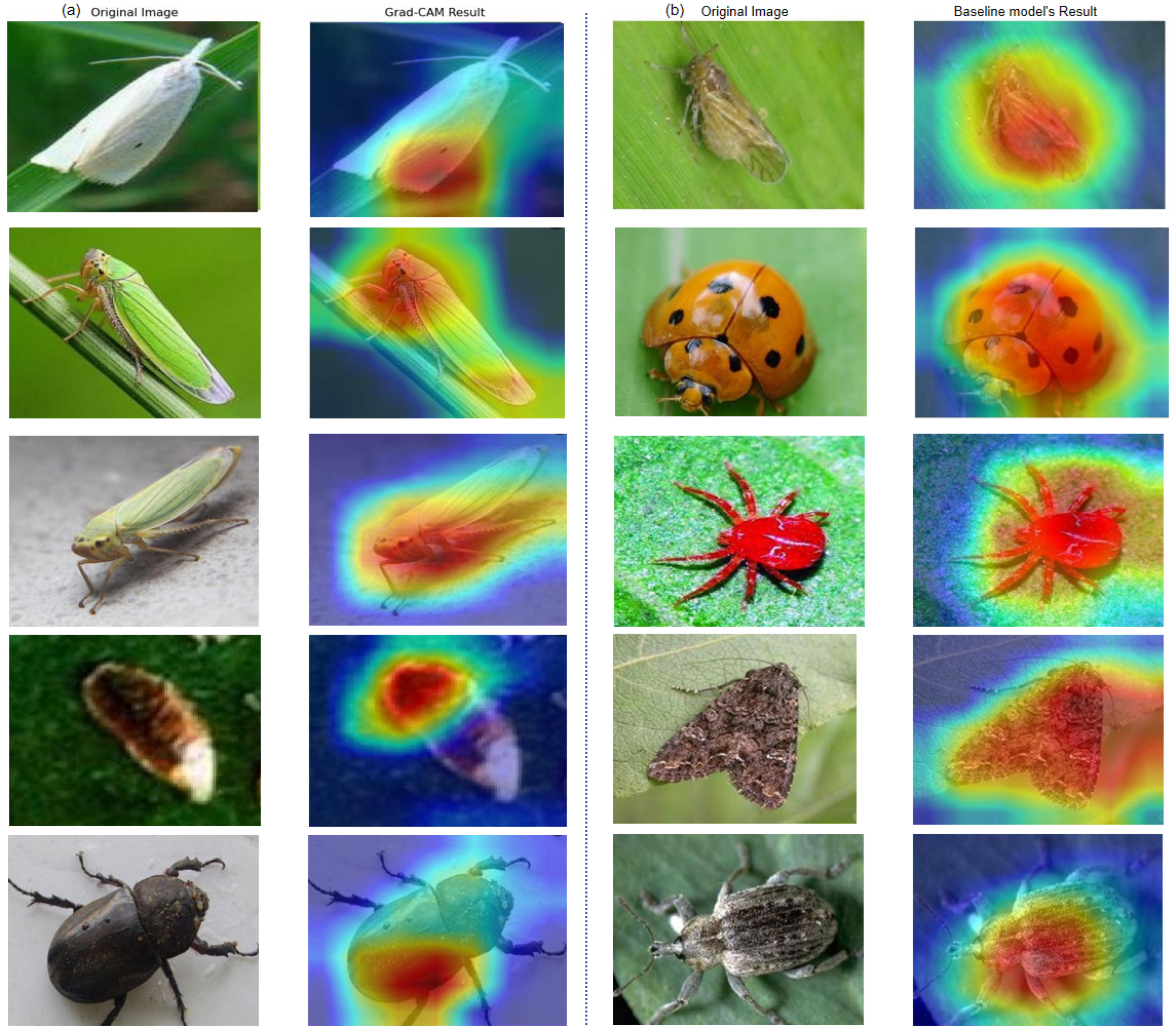 - Baseline Failure Analysis: In the first row (complex background), the Baseline model’s attention (red region) is scattered across the surrounding leaves and soil. This visualization exposes the “background bias” inherent in single-stage CNNs: without explicit localization, the model erroneously learns environmental correlations (e.g., associating “soil color” with “ground pests”) rather than actual biological features.
