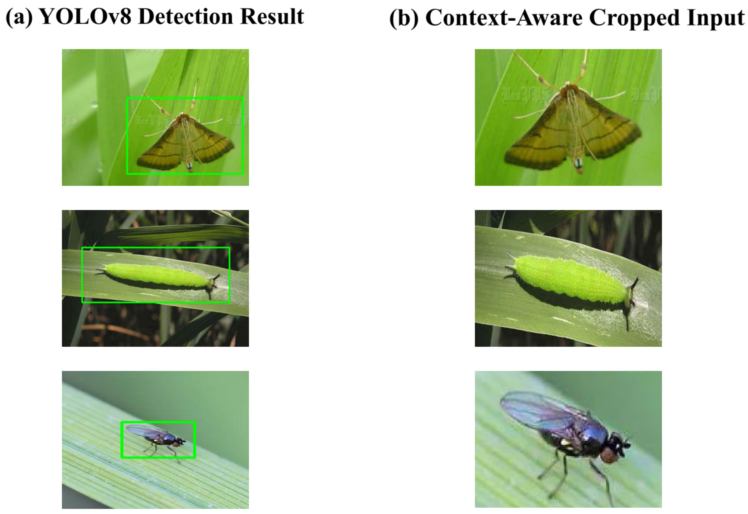- Discussion: Critically, the “Context-Aware Expansion” strategy ensures that the cropped images preserve complete morphological structures—such as the long antennae of the Rice Bug shown in the third column. As highlighted in Section 3.2, preserving these peripheral structures is vital for distinguishing pests from morphologically similar natural enemies (e.g., Syrphidae larvae). The visualization confirms that our cropping strategy retains the necessary “biological context” that standard tight cropping might discard.