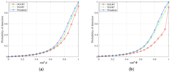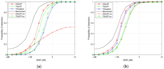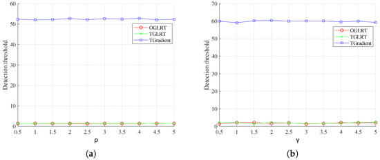 Figure 1a,b illustrate the CFAR characteristics of the OGLRT, TGLRT, and Gradient detectors. In particular, Figure 1a depicts how the detection thresholds vary with different noise power levels denoted by , whereas Figure 1b presents the corresponding thresholds as functions of the parameter . An examination of these figures reveals that the thresholds associated with the three detectors exhibit only minor variations as either or changes. This observation confirms that the proposed OGLRT, TGLRT, and TGradient detectors maintain CFAR behavior with respect to both the noise power and the parameter , which characterizes the structure of the covariance matrix .
