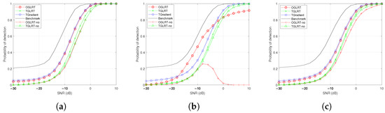 Figure 3a–c depict the relationship between detection probability and the signal-to-jammer-plus-noise ratio (SJNR) under signal mismatch across different dimensions. As shown in Figure 3b, when mismatch occurs in the transmit–receive dimensional signal, the proposed TGLRT and TGradient detectors preserve comparatively high detection performance, indicating strong robustness against such mismatch. Conversely, the OGLRT detector experiences a pronounced degradation in performance under the same conditions. In contrast, the OGLRT detectors do not incorporate virtual signals show higher selectivity but reduced robustness. Figure 3c illustrates the detection results in the presence of Doppler-domain signal mismatch, where all detectors exhibit performance degradation to varying extents. A comparative analysis of Figure 3b,c further reveals that, for an identical level of signal mismatch, discrepancies in the transmit–receive dimension exert a more substantial adverse effect on detection performance than those in the Doppler dimension.