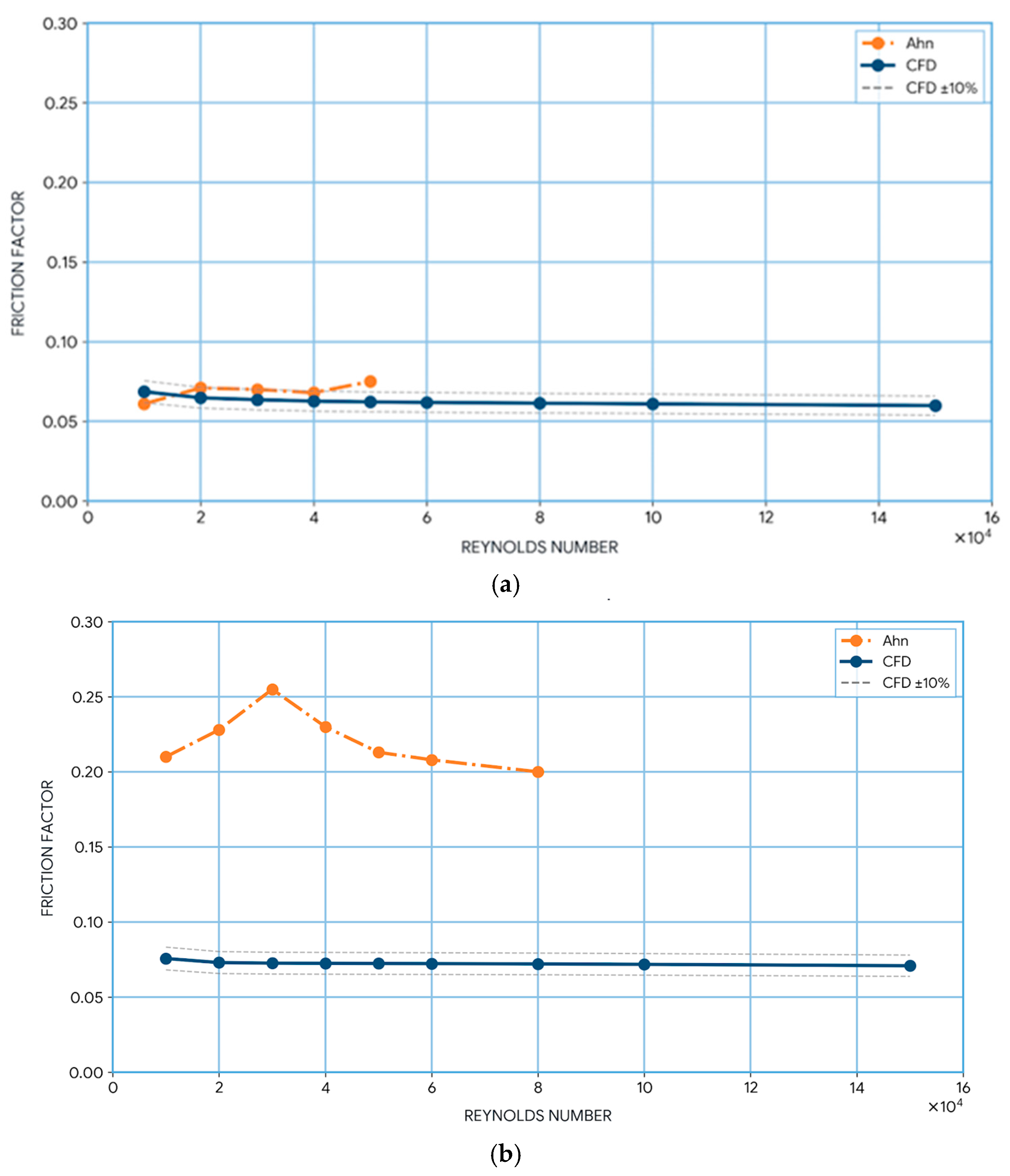 The numerical framework was assessed against independent experimental friction-factor datasets to establish its predictive reliability prior to the diameter-dependent analysis presented in the following sections. Validation was conducted using two widely cited experimental studies: Ahn and Uslu [