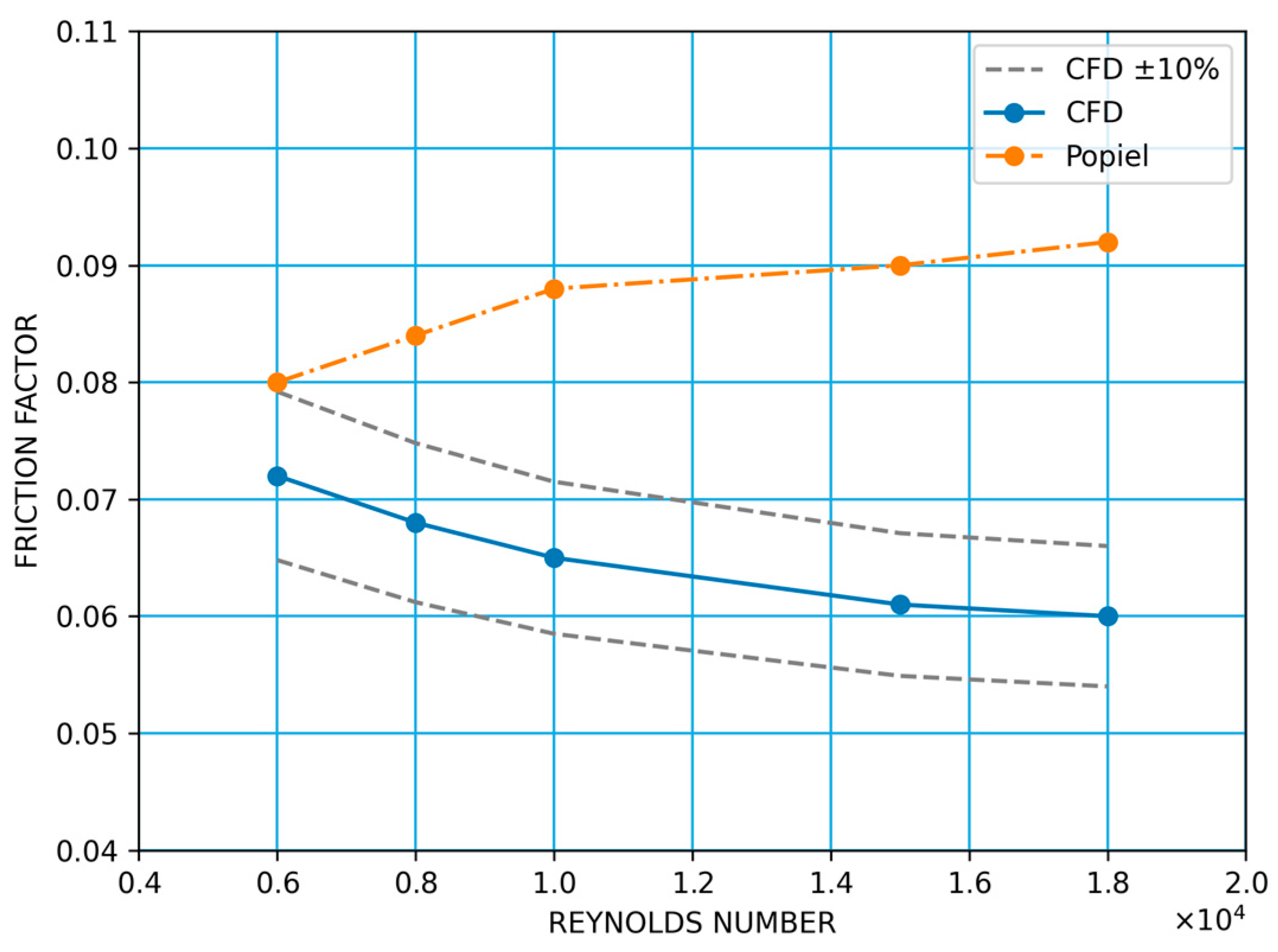 Although the absolute deviation levels for the Popiel dataset are somewhat larger than those obtained for the Ahn and Uslu data, particularly at the lower end of the Reynolds-number range, the numerical model preserves the overall order of magnitude and captures the dominant trend of friction-factor variation within the investigated interval.